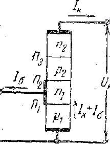 Рис. 5. Структура тринистора. Чтобы ослабить зависимость a (I) при малых токах (особенно у германиевых структур), часто шунтируют эмиттерный переход небольшим сопротивлением R. Тогда значительная часть общего тока ответвляется в это сопротивление, минуя эмиттер. Тем самым эмиттерный ток, а вместе с ним и коэффициент а при прочих равных условиях уменьшаются. В последнее время одну из баз динисторов обычно легируют золотом. Цель такого легирования - уменьшить время жизни и тем самым время переключения. При этом одновременно возрастает отношение w/L (поскольку L =(dt) 1/2), а значит, и коэффициент a, что опять-таки способствует повышению напряжения переключения. Тринистор. Снабдим одну из баз динистора, например п1, внешним выводом и используем этот третий электрод для задания дополнительного тока через переход p1-n1 (рис. 5) (Реальные четырехслойные структуры характерны различной толщиной баз. В качестве управляющей используется тонкая база, у которой коэффициент передачи a1 близок к единице.). Тогда получится прибор, обладающий свойствами тиратрона. Для такого прибора (тринистора) принята та же терминология, что и для обычного транзистора: выходной ток называется коллекторным, а управляющий — базовым. Эмиттером считается слой, примыкающий к базе, хотя с физической точки зрения эмиттером является и второй внешний слой (в нашем случае п2). Условное обозначение тринистора вместе с семейством характеристик показано на рис. 6. Как видим, увеличение управляющего тока Iб приводит прежде всего к уменьшению напряжения прямого переключения. Кроме того, несколько возрастает ток прямого переключения, а ток обратного переключения уменьшается.В результате отдельные кривые с ростом тока Iб как бы «вписываются» друг в друга вплоть до полного исчезновения отрицательного участка (такую кривую называют спрямленной характеристикой). Элементарный анализ тринистора можко провести, исходя из формулы (1), в которой нужно положить Iп3 = Iп2 = Ik и Iп1 = Ik + Iб. Тогда вместо формулы (2) получим для тока Ik более общее выражение Ik = (MIk0+(Ma1)Iб)/(1-Ma) (10) Здесь по-прежнему a = a1 + a3 — суммарный коэффициент передачи, в котором составляющая a3 является функцией тока Ik, а составляющая a1 - функцией суммы токов Ik + Iб. Задавая положительный ток Iб, мы тем самым задаем начальное значение коэффициента a1 (при Ik ==0). Поэтому любому току Ik будет соответствовать большее значение a, а значит, и большее значение а, чем при Iб = 0.