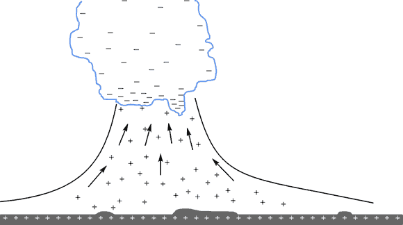 Рис. 1. Накопление зарядов в облаке. С другой стороны на отрицательно заряженную часть облака, будет действовать сила притяжения со стороны положительно заряженной массы воздуха и земли, направленная вниз, сила Архимеда направленная вверх, а также сила направленная вверх за счет подъема положительно заряженной массы воздуха. В результате часть облака будет выноситься в верхние слои атмосферы, где в зависимости от высоты будет иметь место отрицательная температура, что может привести к образованию града. Облако и восходящий поток воздуха при встречном движении образуют область нейтрализации зарядов. В области нейтрализации зарядов возникнет повышенное давление. Растекание нейтрально заряженного воздуха порождает турбулентность движущихся потоков. Между разноименно заряженными ионами встречно-двигающихся потоков будет находиться своего рода изолятор из нейтрального газа, который все время пополняется за счет нейтрализации положительных и отрицательных ионов при их рекомбинации. За счет турбулентности движения потоков направление движения части массы воздуха и капель воды в туче совпадает в области, где происходит нейтрализация ионов и воздух «неподвижен», а ниже этой области направлен навстречу падающей капле. В результате такого движения капля, попадая в область «неподвижного» воздуха, будет отдавать этой области свои электроны, заряжая ее за счет положительного ускорения относительно окружающего воздуха. Следует учитывать, что капля в начале движения находилась в области с избытком электронов и, отдавая часть своих электронов, осталась отрицательно заряженной. При дальнейшем движении капли в области с положительными ионами, движущимися навстречу, происходит дальнейшая потеря электронов с ее стороны. В результате отрицательные заряды, накапливаемые в верхней и средней частях облака, будут перемещаться к границе раздела между положительно и отрицательно заряженными областями атмосферы. Сама граница раздела, состоящая из нейтрального газа также будет опускаться к земле. По мере накопления зарядов на земле и в облаке возрастает напряженность электрического поля, а заряды будут сосредотачиваться на обращенных друг к другу поверхностях. Известно, что наибольшая напряженность поля будет на выступающих местах: молниеотводы, деревья, высотные сооружения. Наступает электрический пробой, образуется канал молнии и происходит нейтрализация зарядов накопленных в облаке и положительно заряженной массе воздуха. Пробой наступает не «в землю», а «в положительно заряженную область» воздуха, которая поднимается от земли и находится значительно ближе чем молниеотводы и высотные сооружения. Пробивается промежуток состоящий из «нейтрального» воздуха, который расположен между разноименными зарядами, а для этого не нужна разность потенциалов в миллиарды вольт, которая необходима для пробоя промежутков измеряемых километрами. Явление пробоя примечательно тем, что плотность отрицательных зарядов изолирующего слоя из «нейтрального» воздуха с одной стороны, значительно превышает плотность положительных с другой, поэтому электроны, попадают при пробое в область с положительными ионами и перезаряжают последние. В результате отталкивания между отрицательными ионами образуется зона пониженного давления. Она 