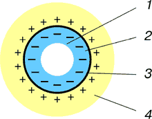 Рис. 3. Устройство шаровой молнии: 1 – область низкого давления, занятая электронами; 2 – область, где происходит ионизация молекул воздуха электронами; 3 – область высокого давления (около 100000 атм.), в которой происходит рекомбинация положительно и отрицательно заряженных ионов и образуется экранирующий слой плазмы (радиус Дебая) и изоляции из нейтральных молекул воздуха; 4 – окружающее пространство, насыщенное положительно заряженными ионами. В области с одноименно заряженными зарядами возникает разряженное пространство за счет отталкивания. В то же время на границе, где происходит нейтрализация положительно и отрицательно заряженных ионов будет присутствовать область повышенного давления, за счет их притяжения. Наличие области повышенного давления, в которой в основном находятся нейтральные молекулы, значительно уменьшает скорость перемещения ионов в этой области, а также увеличивает напряжение пробоя, которое определяется для газов способностью организации каналов. При рекомбинации будет происходить выделение энергии, в результате чего образуется плазма, которая в значительной степени экранирует электрическое поле, что так же ограничивает скорость встречного перемещения разноименных ионов воздуха. Эти процессы, в конечном счете, определяют время устойчивого существования структуры зарядов, которая называется шаровой молнией. В положительно ионизированную область пространства отрицательные заряды могут попадать не только в результате разряда в эту область новой молнии, они могут поступить туда по проводящим предметам попавшими хотя бы частично в эту область. В литературе неоднократно описывалось, что шаровые молнии возникают из розеток. В случае с Рихманом, помощником Ломоносова, шаровая молния возникла из разорванного проводника от молниеотвода. Склонность появляться из дымоходов по всей вероятности объясняется тем, что сажа которая там содержится, является проводником, а сами трубы исполняют роль молниеотводов, причем, так как их нижний конец находится в области насыщенной положительными ионами, а не соединен в данном случае с отрицательно заряженной землей, как у молниеотводов, то, несмотря на свою высоту, они явно имеют преимущество перед последними по притягиванию шаровых молний, особенно если учитывать что разрушение отрицательного заряда в земле, за счет падающих положительно зараженных капель, под строениями происходит намного медленнее, например, если стены выполнены из изолирующих материалов (деревянные, сухой кирпич, и т.д.). На основании вышеизложенного объясним реальное событие. В «Комсомольской правде» промелькнуло сообщение о том, что произошло поражение молнией девушки стоящей недалеко от дерева, в которое угодила молния. При этом пострадала одна туфля и кофточка, все остальное оказалось целым. В данном случае, после удара молнии в дерево, произошел перезаряд земли относительно окружающего воздуха. Последующий разряд, но теперь уже из земли в положительно заряженный воздух, произошел через девушку. Через ту туфлю, которая лучше проводила электричество. А кофточка, которая обладала изолирующими свойствами и препятствовала перемещению электронов к положительно заряженным ионам воздуха, пострадала, так как не могла выдержать возникшего напряжения. Кроме этого, наибольшая пло