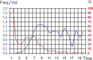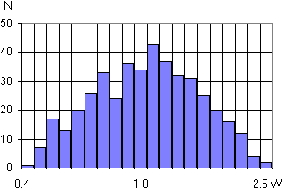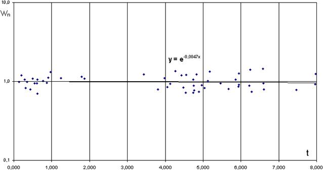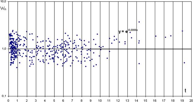 где t – время в миллиардах лет, 2,512 – основание шкалы звездных величин, M1 – звездная величина сверхновой, приведенная к расстоянию 1 миллиард световых лет, mxpeak – наблюдаемая пиковая звездная величина сверхновой. Пересчитав таким образом данные [1] автором получена высокая точность их соответствия формуле (1). И определена абсолютная звездная величина сверхновых типа Ia: M0 aver = M1 – 2,5 lg(108/3,263)2 = –18,5. На рис.1 показано распределение сверхновых по шкале времени (3) по выборке из [1]. С целью снижения дисперсии данных для малых z вводилась коррекция за скорость наблюдателя по отношению к фоновому излучению эфира, принятому 390км/с или 0,0013 скорости света.