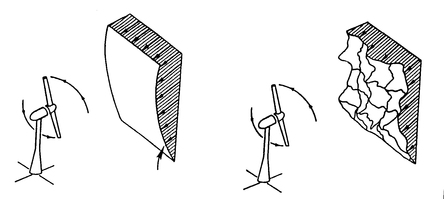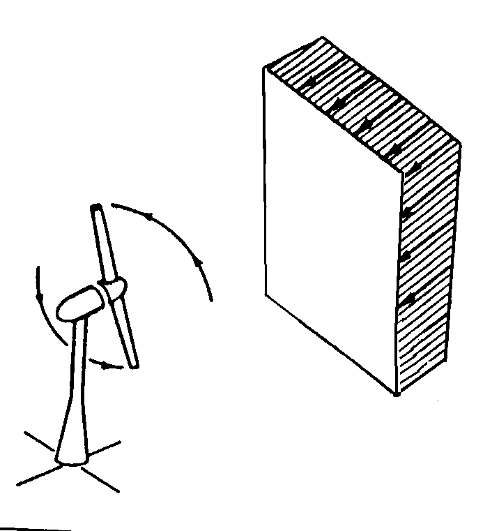 Ветроэнергетические установки (ВЭУ) достигли сегодня уровня коммерческой зрелости и в местах с благоприятными скоростями ветра могут конкурировать с традиционными источниками электроснабжения. Из всевозможных устройств, преобразующих энергию ветра в механическую работу, в подавляющем большинстве случаев используются лопастные машины с горизонтальным валом, устанавливаемым по направлению ветра. Намного реже применяются устройства с вертикальным валом. Кинетическая энергия, переносимая потоком ветра в единицу времени через площадь в 1 м2 (удельная мощность потока), пропорциональна кубу скорости ветра. Поэтому установка ВЭУ оказывается целесообразной только в местах, где среднегодовые скорости ветра достаточно велики. Ветровое колесо, размещенное в свободном потоке воздуха, может в лучшем случае теоретически преобразовать в мощность на его валу 16/27=0,59 (критерий Бетца) мощности потока воздуха, проходящего через площадь сечения, ометаемого ветровым колесом. Этот коэффициент можно назвать теоретическим КПД идеального ветрового колеса. В действительности КПД ниже и достигает для лучших ветровых колес примерно 0,45. Это означает, например, что ветровое колесо с длиной лопасти 10 м при скорости ветра 10 м/с может иметь мощность на валу в лучшем случае 85 кВт. Наибольшее распространение из установок, подсоединяемых к сети, сегодня получили ветроэнергетические установки (ВЭУ) с единичной мощностью от 100 до 500 кВт. Удельная стоимость ВЭУ мощностью 500 кВт составляет сегодня около 1200 долл/кВт и имеет тенденцию к снижению. Наряду с этим создаются ВЭУ и с существенно большей единичной мощностью. В 1978 г. в США была создана первая экспериментальная ВЭУ мегаваттного класса с расчетной мощностью 2 МВт. Вслед за этим в 1979-1982 гг. в США были сооружены и испытаны 5 ВЭУ с единичной мощностью 2,5 МВт. Самая большая к тому времени ВЭУ (Гровиан) мощностью 3 МВт была сооружена в Германии в 1984 г., но, к сожалению, она проработала лишь несколько сот часов. Построенные несколько позже в Швеции ВЭУ WTS-3 и WTS-4 мощностью соответственно 5 и 4 МВт были установлены в Швеции и США и проработали первая 20, а вторая 10 тыс.ч. В Канаде ведутся работы по созданию крупных ветровых установок с вертикальным валом (ротор Дарье). Одна такая установка мощностью 4 МВт проходит испытания с 1987 г. Всего за 1987-1993 гг. в мире было сооружено около 25 ВЭУ мегаваттного класса. Расчетная скорость ветра для больших ВЭУ обычно принимается на уровне 11-15 м/с. Вообще, как правило, чем больше мощность агрегата, тем на большую скорость ветра он рассчитывается. Однако в связи с непостоянством скорости ветра большую часть времени ВЭУ вырабатывает меньшую мощность. Считается, что если среднегодовая скорость ветра в данном месте не менее 5-7 м/с, а эквивалентное число часов в году, при котором вырабатывается номинальная мощность не менее 2000, то такое место благоприятно для установки крупной ВЭУ и даже ветровой фермы. Автономные установки киловаттного класса, предназначенные для энергоснабжения сравнительно мелких потребителей, могут применяться и в районах с меньшими среднегодовыми скоростями ветра. Сегодня в некоторых промышленно развитых странах установленная мощность ВЭУ достигает заметных значений. Так, в США установлено более 1,5 млн. кВт ВЭУ, в Дании ВЭУ производят около 3 °/о потребляемой страной э