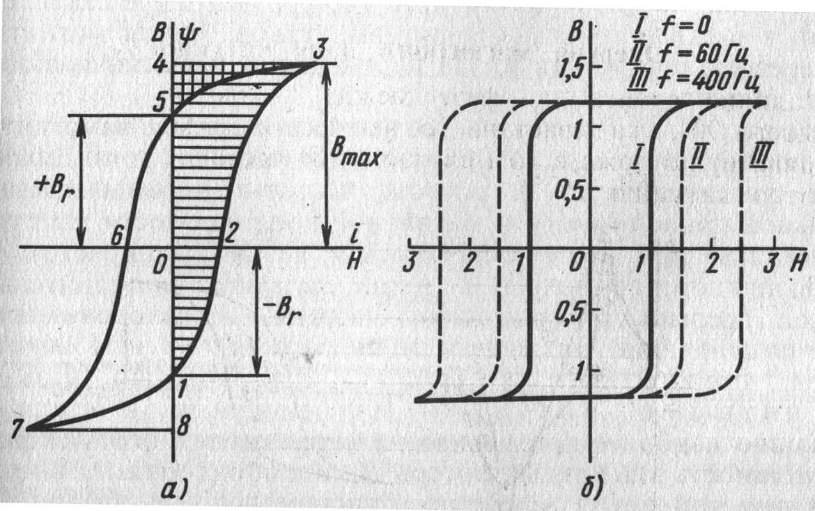 Реферат: Влияние гистерезиса и вихревых токов на ток катушки с ферромагнитным сердечникомРеферат: Влияние гистерезиса и вихревых токов на ток катушки с ферромагнитным сердечникомВлияние гистерезиса и вихревых токов на ток катушки с ферромагнитным сердечником Магнитный гистерезис вносит дополнительные изменения в форму кривой намагничивающего тока. Эти изменения обусловлены тем, что при увеличении магнитного потока ход кривой тока определяется восходящей, а при уменьшении потока – нисходящей ветвью петли гистерезиса. Ток в катушке с учетом магнитного гистерезисаНа рис 1. изображен график Ф(i) зависимости магнитного потока от намагничивающего тока катушки с ферромагнитноым сердечником (петля магнитного гистерезиса). Петля гистерезиса, полученная при медленном циклическом изменении намагничивающего тока, называется статической. р На том же рисунке дана кривая тока i(wt), показывающая, что при увеличении магнитного потока кривая тока идет выше, а при уменьшении потока – ниже кривой, построенной при тех же условиях по основной кривой намагничивания. Кроме того начальные фазы потока и тока не совпадают (угол сдвига ), в связи с чем первая гармоника тока (или эквивалентный ток) отстает от приложенного напряжения на угол < 900. Энергия магнитного поля катушкиНаличие сдвига по фазе между током и напряжением, меньшего 900, указывает на то, что активная мощность в цепи не равна нулю даже в том случае, если активное сопротивление обмотки катушки R=0. Следовательно, ток катушки из-за потерь на гистерезис имеет активную составляющую, а средняя мощность за период не равна нулю. В данном случае активная мощность характеризует расход энергии на перемагничивание ферромагнитного сердечника. Изменение энергии магнитного поля dWm выражается площадью элементарного прямоугольника со сторонами i и d. Следовательно dWм = id Энергия магнитного поля, запасенная при увеличении тока в катушке, определяется площадью, ограниченной кривой (i) и осью ординат (рис.2): Wм = Sid. р Рассмотрим цикл перемагничивания сердечника, начиная с точки 1, когда i=0 и B= -B (рис. 3,а). Для размагничивания сердечника от –B, до 0 и последующего намагничивания до Bmax затрачивается энергия, которая определяется площадью, ограниченной контуром 1-2-3-4-0-1. Эта площадь непосредственно определяет величину HdB, но dB пропорционально d, а H пропорционально i. р На всем протяжении рассматриваемой части петли магнитного гистерезиса (1-2-3) напряженность поля Н и приращения магнитного потокосцепления положительны. При размагничивании от Вмах до + В, (участок 3-5) напряженность поля по-прежнему положительна, а приращения потокосцепления отрицательны. Площадь, ограниченную контуром 3-4-5-3, нужно считать отрицательной. Энергия, пропорциональная этой площади, возвращается источнику. На участке 5-6-7 петли гистерезиса напряженность поля и приращения потокосцепления отрицательны. Площадь, ограниченная контуром 5-6-7-8-1-0-5, положительна. Это означает, что энергия опять потребляется от источника. Размагничивание на участке 7-1 сопровождается возвращением энергии источнику в количестве, пропорциональном площади 7-8-1-7. Таким образом, энергия, израсходованная в единице объема ферромагнитного сердечника за один цикл перемагничивания, определяется площадью, ограниченной петлей магнитного гистерезиса. Потери энергии в 