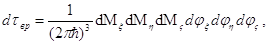 а штрих у интеграла означает, что интегрирование должно производиться лишь по тем ориентациям молекулы, которые физически отличны друг от друга. Если молекула обладает какими-либо осями симметрии, то повороты вокруг этих осей совмещают молекулу саму с собой и сводятся к перестановке одинаковых атомов. Ясно, что число физически неразличимых ориентации молекулы равно числу допускаемых ею различных поворотов вокруг осей симметрии (включая тождественное преобразование—поворот на 360°). Обозначив это число посредством [2], можно производить интегрирование в (2.1) просто по всем ориентациям, одновременно разделив все выражение на В произведении dxdhdzтрех бесконечно малых углов поворота) можно рассматривать dx, dh как элемент dsz телесного угла для направлений оси z. Интегрирование по dsz производится независимо от интегрирования по поворотам dzвокруг самой оси z и дает 4p. После этого интегрирование по djz дает еще 2p. Интегрируя также и по dMxdMhdMz (в пределах от -¥ до +¥), найдем в результате