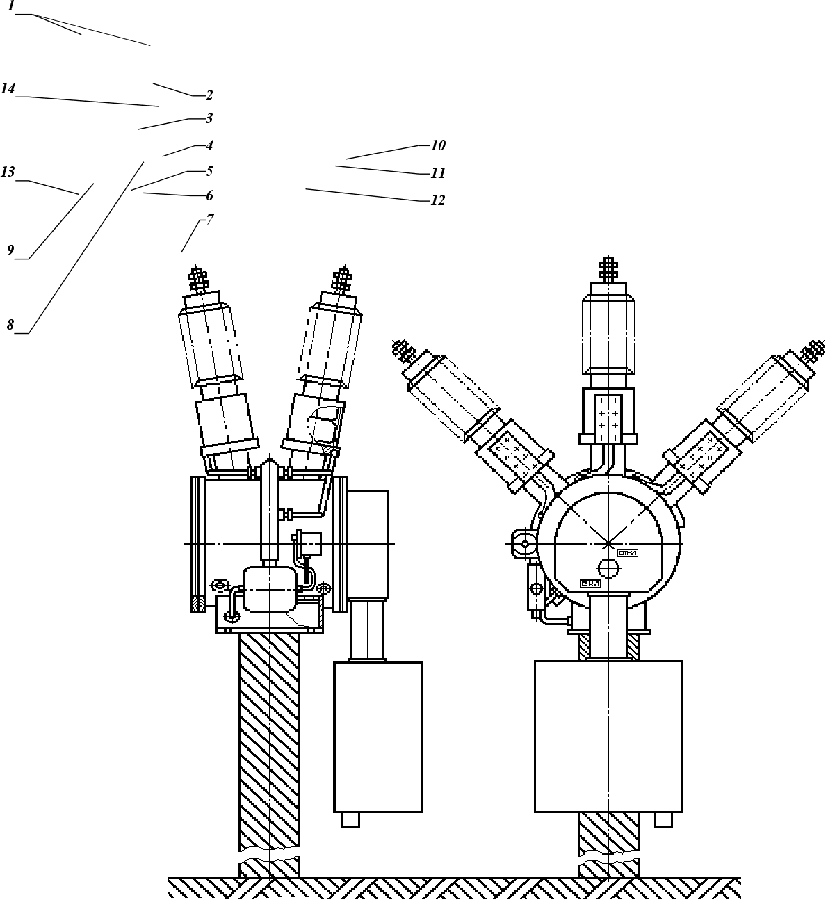 ВГБ-35 Рис. 1.8.1 1-ввод; 2-трасформатор тока; 3-бак; 4-фланец; 5-клемная коробка; 6-устройство подогревательное; 7-шкаф с приводом; 8-сигнализатор давления; 9-клапан; 10-крышка; 11-механизм; 12,13,14-кольца уплотнительные. Бак 3 заполняется на заводе-изготовителе элегазом, соответствующим ТУ 6-02-1249. Давление заполнения, приведенное к 20°С, указано в технических данных. Внутри, на дне бака, закреплен тканевый мешок с адсорбентом, который поглощает как возможную влагу, так и газообразные продукты разложения, образующиеся при горении дуги. Контактно-механическое устройство изображено в отключенном положении на рис. 1.8.2, а; рис. 1.8.2, б. Оно содержит изоляционные диски 3, жестко закрепленные с помощью болтов 12 и стойки 18 на корпусе 17. Корпус 17 закреплен болтами 10 на фланце 5 бака выключателя. На дисках 3 размещены шесть дугогасительных катушек 2 и неподвижные контакты 1 (по две дугогасительных катушки и два неподвижных контакта на каждый полюс). Неподвижные контакты 1 состоят из основания, на котором закреплены подпружиненные ламели 13 и 14, причем ламели 14 снабжены дугостойкими металлокерамическими напайками. Неподвижные контакты 1 шинами 7 соединены с нижними концами вводов 16. На главном валу 6 закреплена изоляционная траверса 8, несущая на своих концах, расположенных под 120°, подвижные контакты 4 трех полюсов.