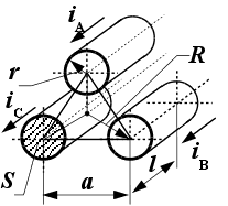 Рис 3.3.1 Рис 3.3.2 3.4. ОПРЕДЕЛЕНИЕ ПОТЕРЬ МОЩНОСТИ В СИСТЕМЕ ПОДВИЖНЫХ КОНТАКТОВ На рис. 3.4 показана трёхфазная симметричная система токов (токи в фазах равны друг другу и сдвинуты на 120) при расположении сплошных круглых токоведущих элементов (ТЭ) в вершинах равностороннего треугольника. Используя примеры подобных расчётов в {6, стр. 117}, определим потери в ТЭ. Система подвижных контактов Исходными данными служат геометрические размеры ТЭ r = 0,0125 м; R = 0,1575 м; a = 2.R.Cos30 = 0,2728 м; l = 0,175 м. Удельное сопротивление меди при 0С 0 = 1,62.10-8 Ом.м. Температурный коэффициент сопротивления меди cu = 4,3.10-3 К-1. Максимально допустимая температура медных ТЭ в элегазе (номинальный режим) доп = 105С. Расчёту подлежат: