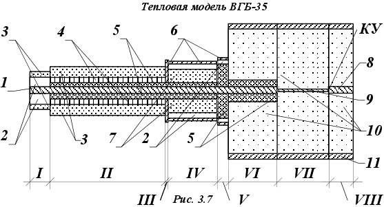 Gr = 9,81...x3/2 = 9,81.0,00311.0,0253.17/(25,18-7)2=1,278.106. 9. Произведение критериев Грасгофа и Прандтля Gr.Pr = 1,278.106.0,75185 = 9,608.105. 10. Режим теплообмена при Gr.Pr = 9,608.105 отвечает расчётной формуле : kт.к = A2.(/x)1/4 = 2,069.(17/0,025)1/4 = 10,565 Вт/(м2.К) {6, стр. 146, таблица 4-5}. 11. Постоянная излучения = 0,25 {6, стр. 155, таблица 4-7}. 12. Коэффициент теплообмена излучением kт.и = 5,673.10-8..(ном4-04)/ = 5,673.10-8.0,25.(3304-3134)/17 = 1,887 Вт/(м2.К). 13. Суммарный коэффициент теплообмена kт.с = kт.к + kт.и = 10,565 + 1,887 = 12,452 Вт/(м2.К). (Значение используется в программном расчёте токоведущего контура для Г2). 14. Площадь поверхности подвижных контактов, общей длиной S = 3.l.2..r = = 3.0,175.2..0,0125 = 0,04123 м2 (см. данные из п. 3.4.). 15. Активное сопротивление ТЭ при ном = 57С (см. данные из п. 3.4.) R=kд.п.0.(1+cu.ном).l/S=1,034.1,62.10-8.(1+4,33.10-3.57).0,175/4,909.10-4=7,446.10-6 Ом. 16. Суммарный тепловой поток, выделяющийся в трёх подвижных контактах при номинальном токе Ф = 3.Iном2.R = 3.6302.7,446.10-6 = 8,866 Вт (см. п. 3.4.). 17. Температура поверхности ТЭ ном = Ф/(kт.с.S) + 0 = 8,886/(12,452.0,04123) + 40 = 57,3 С. Кроме нагрева подвижных контактов имеет место нагрев в контактных узлах (самый значительный по сути!), неподвижных контактах, алюм. шинах, соединяющих выводы проходных изоляторов с неподвижными контактами. Всё это рассматривается и учитывается в программном расчёте токоведущей системы высоковольтных выключателей {5}. 3.6. ПОРЯДОК ТЕПЛОВОГО РАСЧЁТА ТОКОВЕДУЩИХ СИСТЕМ МЕТОДОМ ТЕПЛОВЫХ СХЕМ 1. Разработка тепловой модели токоведущих систем (ТС) аппарата в виде стержневой системы, в которой выделяются участки однородности. 2. По тепловой модели строится тепловая схема. Несовершенство теплового и электрического контакта на стыке стержней учитывается в тепловой схеме источниками теплового потока и теплового сопротивления. 3. Расчёт всех сопротивлений и источников, входящих в тепловую схему. 4. Тепловая схема рассчитывается по методам, применяем в электротехнике, и находятся температуры на границах каждого участка. 5. По уравнениям связи для каждого участка определяются параметры, необходимые в дальнейшем для построения графика распределения теплового потока вдоль токоведущей системы. 3.7. ПОСТРОЕНИЕ ТЕПЛОВОЙ МОДЕЛИ ТОКОВЕДУЩЕЙ СИСТЕМЫ Для теплового расчёта ТС ВГБ-35 программой {5}, необходимо упростить исходную токоведущую систему до системы коаксиальных цилиндров, что в принципе возможно, при замене корпуса бака выключателя эквивалентным цилиндром того же объёма, имеющим ось симметрии, совпадающую с осью симметрии одного из шести проходных изоляторов выключателя. (Рассматриваем только одну фазу и в силу вертикальной симметрии конструкции бака с проходными изоляторами, ограничиваемся следующей цепочкой: ввод проходного изолятора токопровод изолятора алюминиевая шина, соединяющая вывод изолятора с неподвижным контактом контактный узел подвижный контакт половинной длины элегаз). Алюминиевая шина прямоугольного сечения заменяется эквивалентным стержнем, имеющим такое же сечение и длину. График распределения теплового потока данной модели (см. приложение) необходимо зеркально отразить по горизонтали из-за причин, обрисованных выше. Схема тепловой модели показана на рис. 3.7.