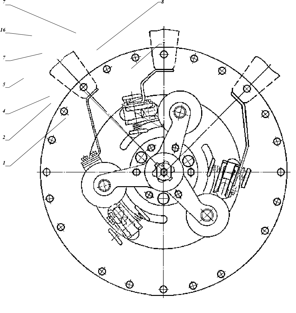 Контактно-механическое устройство Рис. 1.8.2, а 1-неподвижный контакт; 2-дугогасительная катушка; 3-диск; 4-подвижный контакт; 5-фланец; 6-главный вал; 7-шины; 8-траверса; 9-главный рычаг; 10-болт; 11-коробка механизма; 12-болты; 13,14-ламели; 15-пружина; 16-ввод; 17-корпус; 18-стойка. Контактно-механическое устройство