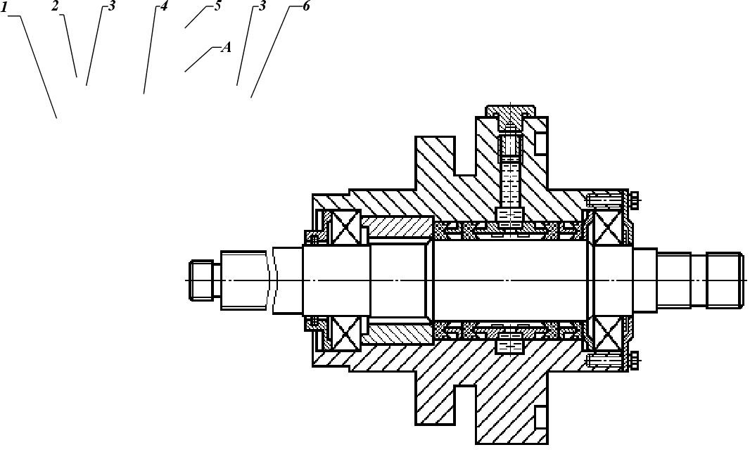 Рис. 1.8.3, а Рис. 1.8.3, б 1-подвижный контакт; 2-неподвижный контакт; 3-пружина; 4,5-ламели; 6-дугогасительная катушка; 7-диск. Подогревательное устройство выключателя содержит два трубчатых нагревателя типа ТЭН-71А и закреплено под днищем бака в специальном корпусе. Концы проводов нагревателей закрыты бусами, забандажированы стеклотканью и выведены через трубу бака в клеммную коробку. Нагреватели на напряжение 220 В соединяются параллельно, а на напряжение 127 В - последовательно. Электроконтактный сигнализатор давления соединен с полостью бака через клапан автономной герметизации. Сигнализатор снабжен устройством температурной компенсации, автоматически приводящей показания давления к температуре плюс 20° С, что фактически обеспечивает контроль уровня плотности элегаза. Сигнализатор имеет шкалу со стрелкой и две пары размыкающих контактов, что позволяет вести как визуальный контроль давления (плотности) элегаза в выключателе, так и давать предупредительные сигналы о снижении давления до 0,33 МПа и о достижении минимально допустимого давления - 0,3 МПа. Предупредительная сигнализация срабатывает только тогда, когда падение давления вызвано утечкой элегаза (понижением его плотности). Для заполнения бака элегазом и его опорожнения служит клапан 9 (см. рис. 1.8.1). Главный вал Узел крепления и уплотнения главного вала показан на рис. 1.8.4. Вал 1 установлен в корпусе 2 на подшипниках качения 3 и уплотнен четырьмя манжетами 4. Кроме того, для усиления уплотнения в корпусе имеется полость А, заполненная жидкостью полиметилсилоксановой ПМС-200. Полость закрывается пробкой 5. Рис. 1.8.4 1-вал; 2-корпус; 3-подшипники качения; 4-манжета; 5-пробка; 6-крышка. Механизм
