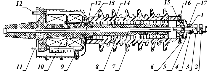 1,11-упоры; 2,8-тяги; 3-рычаг; 4-главный вал; 5-главный рычаг; 6-буферная пружина; 7-ролик; 9-отключающие пружины; 10-колодка; 12-ось. "МЗК"-момент замыкания контактов; "В"-включенное, "О"-отключенное положение. Вводы (см. рис. 1.8.6) служат для подсоединения выключателя к шинам распределительного устройства. Ввод состоит из литой эпоксидной втулки 8 с контактным стержнем, фарфоровой покрышки 7 и помещенных в колпак 9 трансформаторов тока 10. В зоне расположения трансформаторов тока 10 цилиндрическая поверхность эпоксидной втулки 8 имеет металлическое покрытие, на верхней части которого установлен экран 13. Покрытие и экран имеют потенциал земли. Пространство между втулкой 8 и фарфоровой покрышкой 7 заполнено виниполом 14 и с помощью прокладок 16, 17, наконечника 4 загерметизировано от окружающей среды. Трансформаторы тока 10 расклинены клиньями с резиновыми прокладками. Фланцевой частью втулки ввод крепится к баку с помощью болтов 11. Конструкция ввода Рис. 1.8.6 1-гайка; 2,3-стопорный винт; 4-наконечник; 5-крышка; 6-фланец; 7-фарфоровая покрышка; 8-литая эпоксидная втулка; 9-колпак; 10-трансформатор тока встроенный; 11-болты М1070; 12,15-уплотнительные кольца; 13-экран; 14-винипол; 16,17- прокладки.