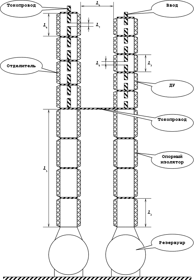 Распределение напряжения, приложенного к колонке опорных изоляторов (см. рис.6), по её высоте неравномерно. Наиболее нагруженным оказывается верхний изолятор, а наименее нагруженным – нижний. Разрядное напряжение такой колонки ниже, чем у одного изолятора, имеющего высоту колонки, т.к. значительное напряжение будет приложено к верхнему изолятору колонки. При этом может оказаться, что напряжение, приходящееся на верхний изолятор, будет больше его напряжения перекрытия и, следовательно, сначала произойдёт перекрытие этого изолятора, а затем и всей колонки. Для выравнивания распределения напряжения по отдельным изоляторам, составляющим колонку, применяется экран, который устанавливается на верхнем изоляторе колонки. В ВВМ-500 применены четыре экрана, установленные на верхних изоляторах каждой из четырёх колонок полюса. Т.о. при расчетах изоляции опорных колонок коэффициентом неоднородности поля можно пренебречь, считая, что экран устраняет неоднородность поля. На рис.6 показаны основные, подлежащие расчёту изоляционные промежутки.