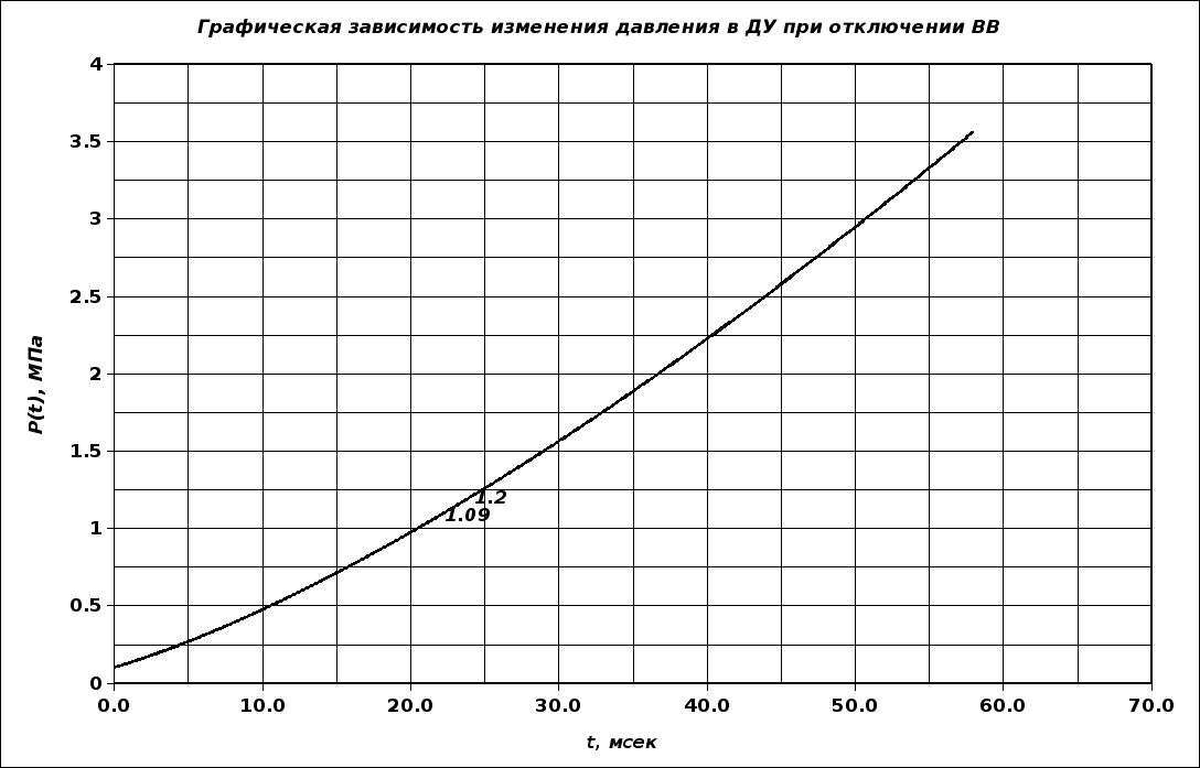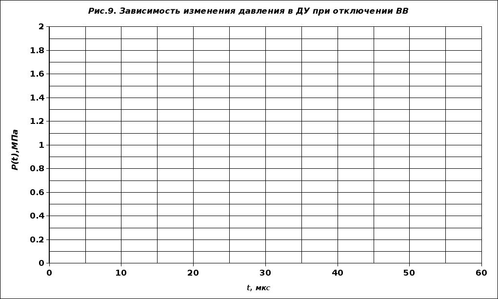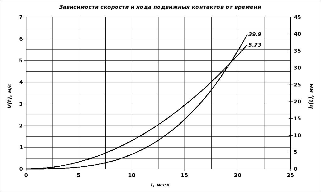 5.1. Расчёт динамики пневматического механизма ДУ ВВ Во включенном состоянии ВВ, давление в колонке ДУ равно атмосферному, т.е. p0 = pа = 0,1 МПа. При подаче команды управления на отключение ВВ в течение менее 0,06 сек {3} контакты ДУ должны разойтись под воздействием давления сжатого воздуха, наполняющего в это время колонку камер ДУ. В момент, когда давление сжатого воздуха сравняется с давлением сопротивления со стороны поршневого механизма подвижного контакта ДУ, подвижный контакт придёт в движение. Сила сопротивления сжатому воздуху Qc Qc = Qп + Pпч + Qтр = 1765,197 + 112,776 + 50 = 1927,937 Н, где Qп - сила номинального контактного нажатия, Qп = 180.9,807 = 1765,197 Н; Pпч - вес подвижных частей (буфера, поршневого кольца, пружины поршневого механизма и подвижного контакта), Pпч = 112,776 Н; {3} Qтр - сила трения в скользящем контакте, принимаем Qтр = 50 Н. Давление, при котором поршневое кольцо камеры ДУ начнёт перемещаться pтр = p0 + Qc/S = 0,1.106 + 1927,937/(5,027.10-3) = 0,483 МПа, где S - активная площадь поршневого кольца камеры, S = (/4).(dн2 – dв2) = (3,142/4).(0,1162 – 0,0842) = 5,027.10-3 м2, где dн и dв – соответственно, наружный и внутренний диаметры поршня {3}. Давление сжатого воздуха в ДУ в первом приближении можно принять pt = pтр + b.t, где b - постоянная нарастания давления наполнения ДУ, b = 600 сек-1; t – время протекания процесса. Ход подвижных контактов h(t)= S/(6.10-5.mпч).b.t3 = 5,027.10-3/(6.10-5.11,5).600.t3 = 4,371.103.t3, где mпч – масса подвижных частей (буфера, поршневого кольца, пружины поршневого механизма и подвижного контакта), mпч 11,5 кг {3}. Максимальное значение, на которое расходятся контакты ДУ при отключении ВВ hмакс = 0,040 м {3}. Время, за которое контакты разойдутся на эту величину можно определить из последней зависимости tдв = 3(6.10-5.11,5.0,040)/(5,027.10-3.600) = 2,092.10-2 сек (20,920 мсек). Скорость движения подвижного контакта описывается выражением V(t)=S/(2.10-5.mпч).b.t2=5,027.10-3/(2.10-5.11,5).600.t2,V(t)=1,311.104.t2, м/с Графические зависимости V(t) и h(t) представлены на рис.8. 5.2. Выбор необходимого объёма резервуара Расчёт ведётся по формуле: Vмин = (0,57.S.с0.t)/ln(Pн/Pк)1/k, где S – площадь сечения выхлопных отверстий. На один полуполюс ВВ приходится четыре цилиндрических сопла диаметром d1 = 0,055 м и двадцать конических отверстий диаметром d2 = 0,015 м. Отсюда: S = (/4).(1.4.d12 + 2.20.d22), где 1,2 - коэффициенты сужения струи отверстий: 1 = 0,5, 2 = 0,7; S = (3,142/4).(0,5.4.0,0552 + 0,7.20.0,0152) = 8,414.10-3 м2; с0 - скорость звука в воздухе при начальных условиях, с0 = 356 м/сек; t – время, в течение которого контакты разомкнуты и происходит свободное истечение воздуха из ДУ, t = tбп = 0,3 сек; {3} Pн – начальное давление в резервуаре Pн = 2,1 МПа; {3} – давление в резервуаре после отключения, Pк = 1,9 МПа; {3} k - показатель адиабаты, k = 1,4. Vмин = (0,57.8,414.10-3.356.0,3)/ln(2,1/1,9)1/1,4 = 2,651 м3. По конструктивным соображениям объём резервуара полуполюса V = 3,6 м3. 5.3. Расчёт процесса наполнения камер ДУ сжатым воздухом 5.3.1. Исходные данные для расчёта Исходные данные для расчёта взяты из {3} и непосредственно с конструкторских чертежей: - Внутренний диаметр камеры ДУ dкв = 0,208 м; - Внутренний диаметр опорной колонки dив = 0,160 м; - Высота колонки камер ДУ полуполюса hк = 3,6 м; - Высота опорной колонки hи = 4,1 м; - Диаметр отверстия главного дутьевого клапана dдк = 0,170 м; - Начальное давление воздуха в резервуаре p0 = 2,0 МПа; - Объём резервуара половины полюса 3,6 м3; - Средний диаметр контактно-поршневого механизма dм = 0,130 м. Эффективное сечение отверстия главного дутьевого клапана S1 = (/4)..dдк 2 = (3,142/4).0,45.0,1702 = 1,024.10-2 м2, где - к