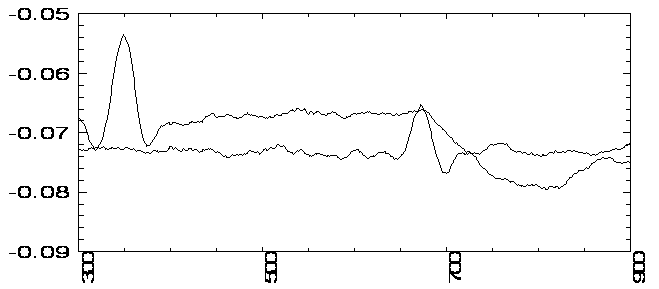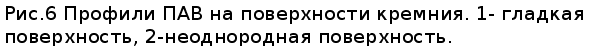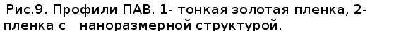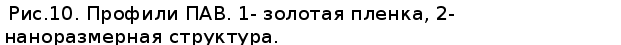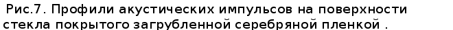 акустической волны оказывается эффективнее на такой поверхности, вследствие лучшего поглощения лазерного излучения. Так же проводились исследования ПАВ на поверхности стекла покрытого тонкой загрубленной серебряной пленкой толщиной примерно 50 нм., наблюдалось затухание волны, связанное с рассеянием на неоднородностях поверхности, профили импульсов 1 и 2 (рис.7) в данном случае получены для различных расстояний между точками возбуждения и регистрации (профиль 1 регистрировался на расстоянии 2 мм от точки возбуждения, профиль 2 на расстоянии 4 мм от точки возбуждения). Так же при распространении волны наблюдалось искажение ее профиля, что может быть связано с дифракцией волны на неоднородностях пленки и рассеянием в объемные волны. Исследование распространения ПАВ по периодической структуре проводилось на образце, который изображен на рисунке 8, периодическая структура на его поверхности была получена следующим образом. На стеклянную подложку напыляют золотую пленку толщиной порядка 50 нм. Затем, образец погружают в емкость с глицерином (рис.8), на поверхности которого плавают поллистироловые шарики диаметром 500 нм. Далее пластинку вытягивают таким образом, что на поверхности золотой пленки образуется монослой из шариков, в промежутки между которыми снова напыляется золото, причем время напыления в данной фазе изготовления образца равно времени напыления пленки, поэтому средняя высота неоднородностей также составляет 50 нм. После чего производится отжиг поллистирола и получается периодическая структура, состоящая из призмочек с вогнутыми гранями (длина грани 100 нм., расстояние между объектами порядка 500 нм.). На рисунках 9 и 10 представлены профили рэлеевских волн на поверхности стекла с тонкой золотой пленкой на которой сделана наноразмерная периодическая структура, описанная выше. Профиль 1 (рис.9) получен при возбуждении волны в точке А (рис.8) и регистрации в точке Б, т. е. акустический импульс проходит по поверхности гладкой пленки. Импульс 2 получен при возбуждении в точке А/ и регистрации в точке Б/ (импульс проходит через периодическую структуру). Профили сдвинуты относительно друг друга, это связано с замедлением волны 2.
