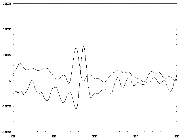 Профили волн на рисунке 10 также сдвинуты (наблюдается замедление рэлеевской волны), при этом волна 1 возбуждалась в точке С (волна 2 в точке С/), а регистрировалась в точке Д (волна 2 в точке Д/), т. е. волна 1 распространялась на гладкой поверхности, а волна 2 по периодической наноразмерной структуре (при этом волна 2 возбуждалась и регистрировалась на этой структуре). Импульс 2 приходит с задержкой 20 нс., что составляет замедление скорости порядка 50 м/с. В данном случае длина ПАВ составляла 100 мкм., при размере дефекта периодической структуры порядка 100 нм., т. е. длина волны много больше периода системы, поэтому не наблюдалось брэгговского отражения волны, а периодическая система работает, как неоднородная поверхность (шероховатая пленка). Заключение. Целью данной работы являлось исследование взаимодействия ПАВ Рэлея с наноразмерными неоднородностями на поверхности твердого тела. Для этого была отработана методика исследования ПАВ при помощи бесконтактного оптического зондирования. В ходе работы были рассчитаны параметры оптической системы, позволяющей исследовать форму ПАВ, распространяющейся на поверхности твердого тела. В данной установке для оптической генерации поверхностной волны использовался импульсный YAG лазер ( длительность импульса 20 нс.), луч HE-NE лазера использовался для зондирования поверхности, для регистрации электрического сигнала использован широкополосный (полоса пропускания порядка 1ГГц.) высокочастотный усилитель и электронный осциллограф, позволяющий разрешать импульсы длительностью 10 нс., сопряженный с компьютером. Экспериментально стабилизированы параметры оптической системы и электронных схем. Экспериментально было показано, что имеет место дисперсия и затухание рэлеевской поверхностной волны, которые обусловлены взаимодействием с неоднородностями, проведено сравнение результатов с теоретическими расчетами [7]. Исследования проводились на поверхности кремния с нанесенными на нее кластерами, было обнаружено замедление ПАВ, по сравнению с волной на гладкой поверхности, которое составило 161м/с. Кластерная структура на поверхности имеет сложную морфологию для которой нельзя вывести точные теоретические оценки, но можно воспользоваться моделями для треугольной и косинусоидальной неоднородностей. Расчеты для треугольной неоднородности дают результат замедления скорости 135 м/с., для косинусоидальной 198 м/с. Таким образом данные модели могут применяться, но при этом следует рассматривать при расчетах не форму профиля неоднородности, а форму зависимости плотности вещества на поверхности. Также исследовалось взаимодействие ПАВ с наноразмерной периодической структурой зафиксированное при этом замедление волны составило 75 м/с., при этом не наблюдалось брэгговского отражения волны. В ходе исследований наблюдалось изменение формы импульса связанное с его дифракцией на неоднородностях и уменьшение его амплитуды с увеличением длины пройденного пути вдоль неоднородной серебряной пленки. Таким образом данная система может быть эффективно использована в импульсной лазерной оптоакустике для исследования состояния границы между твердым телом и воздухом. На первом этапе работы ставилось целью отработка методики наблюдения взаимодействия ПАВ с неоднородностью границы. Для этого была выбран