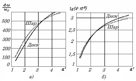 Рис. 9.10. Сравнение параметров резонатора с диэлектрическим шаром и диском К тому же выводу приходим,