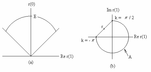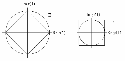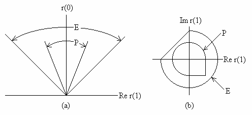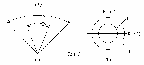 или, словами, следующее. Теорема о продолжимости : .вектор Таким образом, положительные полиномы естественно имеют место в задаче продолжаемости, поскольку они определяют гиперплоскости основы множества Е продолжаемых векторов корреляции. На языке функционального анализа теорема о продолжимости, которая является видом леммы Фаркаша [11], просто констатирует, что Е и Р - положительные сопряженные конусы.[10]. Эта теорема имеет важное следствие относительно перемещения простой характеристики Р, в терминах положительности, на характеристику Е. Хотя введение спектральной основы в рассматриваемую задачу является новым, по существу та же характеристика продолжимости была первоначально использована Кальдероном и Пепинским [l2], и Рудиным [l3]. Рисунок 4 демонстрирует зависимость Е от спектральной основы. Существуют две точки зрения на эту зависимость. Прямая точка зрения отмечает тот факт, что Е является выпуклым конусом, генерированным А; поскольку К уменьшилось, А сжалось и Е теперь меньше, чем на рис.3. Косвенная точка зрения включает ограничения; множество К ограничивает множество Р посредством условия о положительности, а множество Р ограничивает множество P посредством теоремы продолжимости. Итак, когда К сжимается, Р растет, и Е сжимается. Для случая временной последовательности теорема о продолжимости сводится к тесту положительной определенности теплицевой матрицы, образованной из корреляционных выборок. Следовательно, о продолжимости можно говорить как об общем аналоге положительной определенности. Пример 3.1 : Случай временной