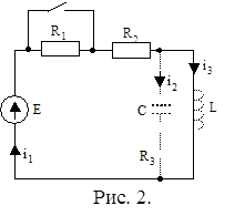 Задача. Дана электрическая цепь, в которой происходит коммутация (Рис. 1). В цепи действует постоянная ЭДС Е. Требуется определить закон изменения во времени токов и напряжений после коммутации в ветвях схемы. Задачу
