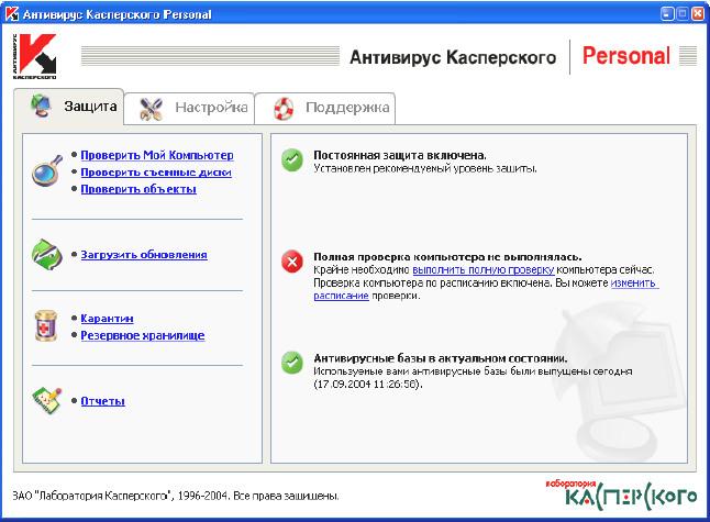 После обнаружения вирусов программа предлагает вам на выбор несколько вариантов: убрать вирус из файла, удалить сами заражённые файлы или переместить их в специальную папку. Можно также вообще отключить режим лечения – тогда ваш антивирус будет только сигнализировать вам об обнаруженных вирусах. Вторая составляющая пакета – Monitor. Эта программа автоматически загружается при запуске Windows и доступна через иконку в левой части Панели задач. Монитор автоматически проверяет все запускаемые на компьютере файлы и открываемые документы и в случае вирусной атаки подаёт сигнал тревоги. Более того, в большинстве случаев Monitor просто не даёт заражённому файлу запуститься, блокируя процесс его выполнения. Эта функция программы очень полезна для тех, кто постоянно имеет дело со множеством новых файлов, например, с активными ходоками по Интернету. Инспектор – модуль, позволяющий отлавливать даже неизвестные вирусы. «Инспектор» использует в работе совершенно иной метод, нежели «Сканер» и «Монитор», а именно метод контроля изменений размеров файлов. Внедряясь в файл, вирус неизбежно увеличивает его «объем» и вызывает изменение его размера – и тем самым выдаёт себя с головой. Mail Checker – модуль, отвечающий за проверку «на лету» сообщений электронной почты. Script Checker – охотник за вирусными и троянскими скриптами. Office Guard – аналогичный модуль для проверки каждого загружаемого документа Microsoft Office. В версии Personal отсутствуют модули Script Checker и Office Guard, а самая простая версия Lite, рассчитанная на домашних пользователей, включает лишь базовый модуль и программу автоматического обновления. У Антивируса Касперского масса достоинств – удобство управления, регулярность и частота выпуска обновлений, а также большое количество версий для различных операционных систем. Возможно, именно поэтому Антивирус Касперского лидирует на корпоративном рынке – большинство фирм используют для защиты своих локальных сетей именно этот продукт. Однако назвать «Касперского» идеальным антивирусом для дома мешает его громоздкость и медлительность – KAV очень требователен к аппаратным ресурсам. К тому же цену на новые версии KAV трудно назвать низкой. Авторов программы можно понять – в условиях практически стопроцентного пиратства иначе просто не получается. И всё же…