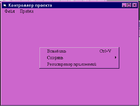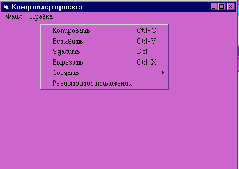Перед запуском программы контроллера программу необходимо инсталлировать ее на жесткий диск. Это может выполнить как специальная программа инсталляции, так и сам пользователь. Нужно установить саму программу в специальную директорию, а специальные DLL-файлы добавить в директорию с системой Windows. Процесс это сложный для начинающего пользователя. По этому рекомендуется доверить его программе инсталляции. После установки программы на диск ее можно запускать, для этого нужна лишь дважды щелкнуть на иконке программы или в главном меню Windows (“Пуск”) выбрать пункт “Выполнить” и изменить путь до исполняемого файла до запускаемого файла контроллера - Controller.exe и нажать кнопку “ОК”. После чего программа запустится и на экране появится главная форма программы (окно). Интерфейс программы позволяет, зная общие принципы построения интерфейса в системе Windows 95, без особого труда научится пользоваться программой. Кроме того контекстная помощь и использование стандартных клавишных комбинаций для стандартных операций применяемых в системе намного облегчают пользование программой. Основное окно программы состоит из рабочей области и меню, а также меню появляющееся при нажатии правой кнопки мыши (рис. 3.1). Все управление программой обычно осуществляется графическим манипулятором (мышью) и набором горячих клавиш на клавиатуры, возможно управление только клавиатурой. Система ниспадающих меню позволяет оперативно управлять процессом проектирования. Меню “Файл” состоит из пунктов открытия проекта, сохранения проекта, открытие нового проекта, выхода из программы. Меню “Правка” позволяет посредствам буфера обмена информацией обмениваться информацией между проектами, а также изменять текущий проект, копировать объекты в буфер обмена и из него, удалять часть объектов (рис 3.2). Меню “Создать” кроме непосредственно прямого выбора в линейке меню, через меню “Правка”, можно получить нажав правую кнопку мыши, из него можно выбрать объект (документ или функцию OLE, или зарегистрировать приложение OLE Automation) который необходимо создать. После выбора объекта запускается редактор свойств выбранного объекта (рис.3.3). Как видно из иллюстрации, в этих формах все свойства описаны непосредственно в форме. Все свойства документов и функций после заполнения сохраняются в переменных главного модуля. Назначение переменных главного модуля, а значит и назначение свойств объектов были описаны в предыдущем разделе Заполнив эти формы создается заданный объект который можно перемещать указателем мыши. Правой кнопкой мыши можно через возникшее меню всегда изменить свойства объекта (выбрав “Свойства”). Кроме того используется следующие способы управления объектами созданными в процессе проектирования. Возможно объединение объектов в группу, для этого нужно нажав левую кнопку мыши не отпуская обвести те объекты которые объединяются в группу, при отпускании кнопки объекты выделятся в рамку. С этими выделенными объектами возможно теперь выполнять групповые операции (перемещения, удаления копирования и т.д.) через меню “Правка” или по правой кнопки мыши. Над документами также выполняются собственно операции их изменения, то есть в случае применения программы в конструкторском проектировании, их изменение возможно либо непосредственно приложением ко