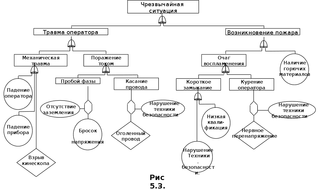 Специальность оператора ЭВМ относится к профессиям с низкой степенью риска. Основными источниками опасности на рабочем месте оператора ЭВМ является опасность возникновения пожара, опасность получения травмы и опасность поражения электрическим током. Необходимо синтезировать дерево причин (опасностей) на рабочем месте (рис.5.3.). Очевидно, что главными источниками чрезвычайных ситуаций являются опасность травм оператора и опасность возникновения пожара. Травмы оператора могут произойти вследствие либо механических травм, либо поражения электрическим током. Механические травмы оператора могут произойти в случае: