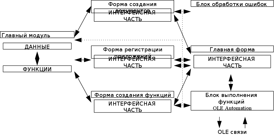2.3. Синтез общей структурной схемы программы Таким образом переходя к синтезу структурной схемы программы можно условно разбить на несколько логических блоков. Каждый из которых представляет собой набор привязанных к объектам подпрограмм, функций и данных (рис. 2.2). Основным звеном программы является главная форма программы (Main_Form.frm) представляющая собой главную интерфейсную часть программы. В которой происходят все преобразования проекта. Проектом, в контексте данной программы, называется совокупность документов и функций OLE Automation находящихся в рабочей области программы в определенном взаимодействии друг с другом. Над которыми могут производится определенные действия по созданию, редактированию, удалению, запуску функций и пр. Приводящие к изменению как самого проекта в целом, так и просто документов входящих в проект. В главной форме содержатся коды по обработке всех меню содержащихся в программе, в том числе и функций работы с системным буфером обмена информацией. Кроме того главная форма содержит программный код обрабатывающий все изменения проекта с точки зрения пользователя. В том числе создание документов, функций, их перемещение в проекте, удаление запуск функций на обработку документов и пр. Из главной формы производится активизация всех дочерних форм программы в режиме модальных окон. То есть окон до закрытия которых работа основной программы главной формы (а иногда и всей системы в целом, как например в случае открытия окна сообщения о глобальной ошибке возможно приводящей к разрушению системы) приостанавливается. Дочерними формами по отношению к главной форме являются, форма создания и редактирования свойств документов (MakeDocForm.frm), форма создания и редактирования свойств функций OLE Automation (MakeFunkForm.frm), форма создания и изменения регистрационных данных приложений поддерживающих OLE Automation или для которых необходима эмуляция этой поддержки (MakeDocForm.frm). Форма создания и редактирования свойств документов содержит все необходимые элементы управления (объекты) для ввода и изменения данных о документе, а также его визуальном представлении в проекте (то есть его иконки).Также в этой форме содержится программный код обрабатывающий эти элементы управления и вносящий изменения в глобальную структуру данных о документах в проекте. Эта форма представляет собой окно под названием “Свойства документа”. Форма создания и изменения регистрационных данных приложений также представляет собой окно под названием “Регистратор приложений” и также содержит в себе ряд объектов (элементов управления) и программный код обрабатывающий эти элементы управления для изменения данных о зарегистрированных приложениях которые могут участвовать в проекте в качестве непосредственных обработчиках документов, а также в виде функции OLE Automation. Форма создания и редактирования свойств функций OLE Automation представляет собой окно “Свойства функции” и содержит элементы управления позволяющие редактировать свойства функции OLE Automation. Форма также содержит программный код модифицирующий глобальные данные о функциях в проекте. Все глобальные данные, а также подпрограммы необходимые для работы большинства блоков программы и не входящие в какую либо форму содержатся в специальном модуле (MainModule), который не содержит в себе никаких объектов и 