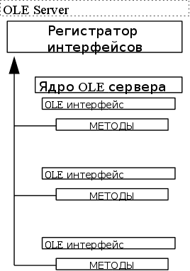 OLE сервер, вернее его часть отвечающая за OLE взаимодействие состоит из двух частей. Регистратора интерфейсов OLE находящихся в ядре, и собственно ядра OLE сервера, которое в свою очередь состоит из OLE интерфейсов обеспечивающих при обращении к конкретному интерфейсу ряд функций называемых методами, они то и являются на самом деле OLE Automation функциями. OLE сервер является несмотря на простоту описания наиболее сложной частью всего взаимодействия посредствам OLE, с точки зрения программиста. Эта сложность обусловлена непосредственно сложностью самих методов OLE, обеспечиваемых сервером. Windows 95 являясь посредником во всех операциях между клиентом и сервером, выполняет координирующую роль администратора при передаче данных. А также именно Windows хранит информацию о всех интерфейсах серверов, здесь существует структурированное хранилище для этих целей. Также Windows выполняет регистрацию этих интерфейсов и отвечает на запросы IID от клиентов. Кроме того Windows содержит буфер обмена информацией между клиентом и сервером. Блок OLE Automation производит непосредственное соединение сервера и клиента и обеспечивает их взаимодействие. Данные могут передаваться через буфер обмена Widows, а также непосредственно между методами и объектом, но этот способ считается не корректным поскольку не позволяет перемещать OLE объект. OLE клиент (контроллер) должен, кроме естественно вызовов самих методов OLE, обеспечивать корректную обработку всех сообщений в обратном направлении (от сервера), Клиент состоит из трех взаимосвязанных частей: блок запроса IID для интерфейса объекта, блок обработки ОLE документа и самого OLE объекта. Первая часть выполняет только подготовительную функцию, она запрашивает IID интерфейс для конкретного объекта у Windows 95, получает этот интерфейс и передает его дальше во второй блок. Во втором блоке проиходит сама обработка документа OLE объекта. Именно в этом блоке обрабатываются такие события как активация извне и активация изнутри. Применяя при этом соответствующие методы обработки этих событий по полученным от первого блока интерфейсы. По этим интерфейсам блок производит активизацию методов применяя либо уже заранее известную информацию о параметрах методов и ответной реакции методов на их активацию, либо полученную через интерфейс эту же информацию. Таким образом воздействуя на объект и являясь посредником при передаче информации между методами сервера и объектом. OLE объект это сам документ помещаемый в приложение клиента. Представляет собой самый зависимый элемент во всей структуре взаимодействия. Он сам ни на что не влияет, однако на него влияют методы сервера вызываемые клиентом. И на самом деле включает в себя только данные и их структуру. Таким же образом как и структура OLE клиента, должна выглядеть структурная схема той части контроллера автоматически связываемых объектов, которая отвечающая за взаимодействие с механизмом связывания и внедрения Windows 95. Поскольку, по сути, контроллер должен являться клиентом практически для всех приложений присутствующих в системе, то информация о OLE интерфейсах отдельных приложений заранее не известна. По этому эта информация должна быть собрана перед внедрением конкретных объектов, то есть в процессе работы программы. Это вносит свои коррективы в конкретную структурную схему взаимодействия пр