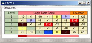 игры ведется в оранжевой ячейке Игра ведется до тех пор, пока счет игрока не станет равным нулю или маркер не попадет на ячейку с номиналом |End|. Игра совсем не так проста, как может показаться. Совсем легко разместить свой маркер так, что на него сместится ячейка с номиналом |Z| - обнуление счета, или |End| - окончание игры. Здесь описывается процесс программирования «текстовой версии» логической табличной игры «Oflameron». Номиналы ячеек представлены на экране в символьном виде, а ячейки представляют собой элементы Label. В следующей части документа будет представлено полное описание процесса разработки графической версии игры и версии игры для карманных компьтеров (PDA). Программирование Заполним ячейки игрового (массив field(8, 6))поля значениями от генератора случайных чисел. Вычислим количество секунд в текущем времени и столько раз «прокрутим» цикл с обращением к генератору случайных чисел: TM = Time 'Получить время в переменную TTMS = Len(TM) 'Определить длину строки с значением времени TTM = Mid$(TM, 7, 2) 'Выделить из строки количество секунд For i = 0 To TTM ‘Цикл с числом повторений, равным количеству секунд Form1.Caption = Int((20 * Rnd) + 1) ‘Значения запишем в заголовок формы, чтобы ‘посмотреть, что работает Next i Заполним массив field(8, 5). Полностью процедура будет: Private Sub Set_Nominal() TM = Time 'Получить время в переменную TTMS = Len(TM) 'Определить длину строки с значением времени TTM = Mid$(TM, 7, 2) 'Выделить из строки количество секунд For i = 0 To TTM Form1.Caption = Int((20 * Rnd) + 1) Next i '-------------------------------------------------- ' Заполним массив field(8, 5) For i = 0 To 7 For j = 0 To 4 field(i, j) = Int((20 * Rnd) + 1) Next j Next i End Sub Теперь можно записать тестовую процедуру Private Sub Fdraw() для того, чтобы посмотреть, как заполняется массив field(8, 6) Процедура будет выглядеть следующим образом: Private Sub Fdraw() Label7.Caption = field(0, 0) Label8.Caption = field(1, 0) Label9.Caption = field(2, 0) Label10.Caption = field(3, 0) Label11.Caption = field(4, 0) Label12.Caption = field(5, 0) Label13.Caption = field(6, 0) Label14.Caption = field(7, 0) Label15.Caption = field(0, 1) Label16.Caption = field(1, 1) Label17.Caption = field(2, 1) Label18.Caption = field(3, 1) Label19.Caption = field(4, 1) Label20.Caption = field(5, 1) Label21.Caption = field(6, 1) Label22.Caption = field(7, 1) Label23.Caption = field(0, 2) Label24.Caption = field(1, 2) Label25.Caption = field(2, 2) Label26.Caption = field(3, 2) Label27.Caption = field(4, 2) Label28.Caption = field(5, 2) Label29.Caption = field(6, 2) Label30.Caption = field(7, 2) Label31.Caption = field(0, 3) Label32.Caption = field(1, 3) Label33.Caption = field(2, 3) Label34.Caption = field(3, 3) Label35.Caption = field(4, 3) Label36.Caption = field(5, 3) Label37.Caption = field(6, 3) Label38.Caption = field(7, 3) Label39.Caption = field(0, 4) Label40.Caption = field(1, 4) Label41.Caption = field(2, 4) Label42.Caption = field(3, 4) Label43.Caption = field(4, 4) Label44.Caption = field(5, 4) Label45.Caption = field(6, 4) Label46.Caption = field(7, 4) End Sub Т.е. здесь просто каждая ячейка записывается в Caption каждой ячейки. Такой метод не стоит считать оптимальным и в последующем можно использовать другие приемы программирования. Чтобы посмотреть резльтаты, нужно вставить вызов двух процедур Private Sub Set_Nominal() и Private Sub Fdraw() в автозапуск при старте программы (на время): Private Sub Form_Load() Set_Nominal Fdraw End Sub Полный проект на Visual Basic этого этапа разработки игры – в файле vbg1.zip Теперь нужно создать процедуру, в которой будет анализироваться содержимое ячеек массива field(8, 6) и в зависимости от их значений будет формироваться нужное символьное значение (номинал) ячейки игрового поля и задаваться нужный цвет символа и фона ячейки. Перепишем процедуру Fdraw() в другую процедуру. Создадим еще одну Label56 для временного хранения «сгенерированного» номинала ячейки и ее цветовых атрибутов (выделена на рисунке).