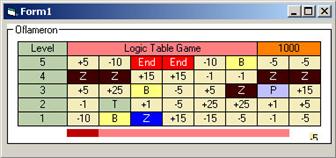 k = k + 1 Next i Next j End Sub Такой вариант заполнения игрового поля НАЧАЛЬНЫМИ значениями (при старте игры) нельзя считать оптимальным. Однако он очень нагляден для понимания алгоритма. Процедура Form_Load() теперь будет выглядеть так: Private Sub Form_Load() Set_Nominal Fdraw Field_Fill End Sub Для того, чтобы посмотреть, как все работает, добавим еще одну процедуру Form_Click() (на некоторое время. Для отладки): Private Sub Form_Click() Set_Nominal ‘Заполнить массив field(i,j) Fdraw ‘Нарисовать на игровом поле значения массива field(i,j) – для отладки Field_Fill ‘Нарисовать реальные номиналы ячеек и цветовые атрибуты End Sub - она полностью идентична процедуре Form_Load() Теперь, кликая мышкой на поле формы Form1 (только формы), Вы можете посмотреть, что значения номиналов ячеек и их цветовые атрибуты меняются правильно. Полный VB-проект с этого этапа разработки игры - в файле vbg2.zip Процедуру Form_Click() можно удалить. Разработаем процедуру Num_Move(), переписывающую значения и цветовые атрибуты ячеек игрового поля построчно, сверху – вниз. А так же – заполняющую верхний ряд игрового поля новыми значениями (т.е. новые значения ячеек как бы вводятся сверху игрового поля). Процедура будет содержать просто операторы копирования. Вы можете сами разработать более оптимальный алгоритм копирования. Private Sub Num_Move() For j = 0 To 4 For i = 0 To 7 field(i, j) = field(i, j + 1) Next i Next j Field_Fill 'Нарисовать новые значения на экран End Sub Чтобы посмотреть, как работает копирование значений и атрибутов ячеек сверху вниз, создадим «временную» процедуру обработки Click-а на рамке Frame1: Private Sub Frame1_Click() Num_Move End Sub Полный VB-проект с этого этапа разработки игры - в файле vbg3.zip Теперь нужно добавить код Private Sub Up_Str_App() для заполнения верхней строки игрового поля новыми значениями. Private Sub Up_Str_App() TM = Time 'Прочитать текущее время TTMS = Len(TM) 'Длина строки с временем TTM = Mid$(TM, 7, 2) 'Выделить секунды For i = 0 To TTM 'Повторить цикл столько раз, сколько секунд Next i '-------------------------------------------------- ' Заполнить верхнюю строку массива field(i, 5) For i = 0 To 7 field(i, 5) = Int((20 * Rnd) + 1) Next i '-------------------------------------------------- 'Заполнить верхнюю строку номиналами, копируя их из Label56 Field_Fill 'Перерисовать значения на экране, с новыми значениями верхней строки End Sub Подключим вызов процедуры в Frame1.Click Полный VB-проект с этого этапа разработки игры - в файле vbg4.zip Покликайте мышкой на поле Frame1 и посмотрите, как все работает! Теперь нужно написать код обработки постановки игроком игрового маркера в любую из ячеек нижней строки игрового поля. Процедура для сохранения цветовых атрибутов всех ячеек нижней строки до установки маркера: Private Sub Save_Color() savecolor(0) = Label7.BackColor 'Запомнить цвет фона Label7 savecolor(1) = Label8.BackColor 'Запомнить цвет фона Label8 savecolor(2) = Label9.BackColor 'Запомнить цвет фона Label9 savecolor(3) = Label10.BackColor 'Запомнить цвет фона Label10 savecolor(4) = Label11.BackColor 'Запомнить цвет фона Label11 savecolor(5) = Label12.BackColor 'Запомнить цвет фона Label12 savecolor(6) = Label13.BackColor 'Запомнить цвет фона Label13 savecolor(7) = Label14.BackColor 'Запомнить цвет фона Label14 End Sub Создадим триггер firstset = 0 Триггер =0, если маркер в нижнюю строку еще не ставили. Общий фрагмент кода, обрабатывающий установку маркера в нижней строке: Private Sub Label7_Click() If firstset = 0 Then Save_Color 'Запомнить цвет фона всех ячеек нижней строки If firstset = 0 Then Label7.BackColor = &HFF0000 'Маркер СИНЕГО цвета If firstset = 0 Then firstset = 1 'Больше не обрабатывать markersave = 0 'Маркер в ячейке, соответствующей savecolor(0) End Sub Private Sub Label8_Click() If firstset = 0 Then Save_Color 'Запомнить цвет фона всех ячеек нижней строки If firstset = 0 Then Label8.BackColor = &HFF0000 'Мар