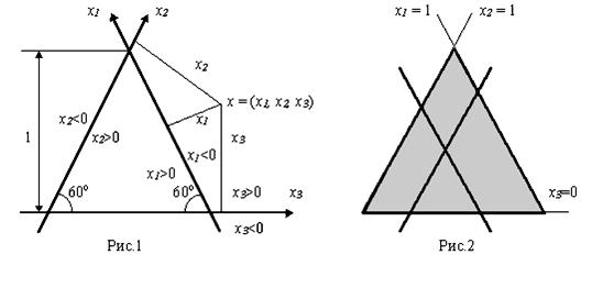 причём дележам x и y соответствуют дележи Очевидно, все явления, описываемые в терминах доминирования дележей, относятся к классам стратегической эквивалентности, поэтому достаточно изучать эти классы (а не сами игры) для существенных игр по их (0,1)-редуцированной форме, а для несущественных игр – по нулевым играм. В любой несущественной игре имеется только один делёж, поэтому никаких доминирований в ней нет. Рассмотрим доминирование дележей в существенной игре на следующем примере. Пример. Пусть имеется (0,1)-редуцированная форма существенной игры трёх игроков с постоянной суммой (равной 1). Поскольку доминирование невозможно ни по одной из одноэлементных коалиций 1,2,3, а также по коалиции, состоящей из всех трёх игроков, то доминирование возможно только по одной из двухэлементных коалиций {1,2}, {1,3}, {2,3}. Для наглядности доминирования дележей введём понятие бароцентрических координат. Осями координат служат три оси x1, x2, x3, составляющие между собой одинаковые углы 60о, ось x3 находится на расстоянии единицы от точки пересечения осей x1 и x2 (рис.1), координаты точки x = (x1, x2, x3) – соответственно расстояния от этой точки до осей x1, x2, x3, взятые с такими знаками, как указано на рис.1. (Например, для точки x на рис.1. x1 < 0, x2 > 0, x3 > 0).