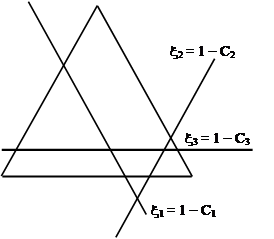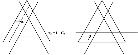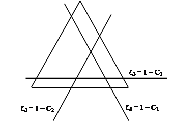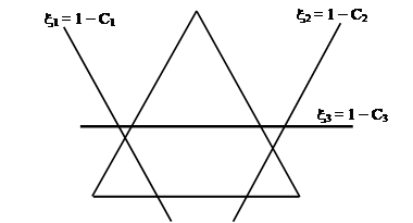 Рис. 7 Это означает, что точка x должна лежать ближе к i-й вершине основного треугольника (см. рис. 7), чем прямая xi = 1 - Сi (i = 1,2,3) Из неравенства (10) путём суммирования получим x1 + x2 + x3 £ 3 - (С1 + С2 + С3) или, учитывая, что x1 + x2 + x3 = 1, получим С1 + С2 + С3 £ 2. Неравенство (12) является необходимым условием существования непустого с-ядра. С другой стороны, если (12) выполняется, то можно взять такие неотрицательные e1, e2, e3, чтобы