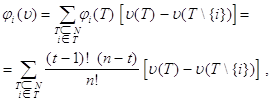 где t – число элементов в T. Вектор Шепли содержательно можно интерпретировать следующим образом: предельная величина, которую вносит i-й игрок в коалицию T, выражается как u(T) - u(T \{i}) и считается выигрышем i-го игрока; gi (T) – это вероятность того, что i-й игрок вступит в коалицию T \{i}; ji (u) – средний выигрыш i-го игрока в такой схеме интерпретации. В том случае, когда u – простейшая,