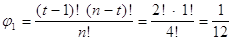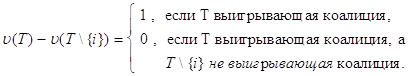 где суммирование по T распространяется на все такие выигрывающие коалиции T, что коалиция T \{i}не является выигрывающей. Пример. Рассматривается корпорация из четырёх акционеров, имеющих акции соответственно в следующих размерах a1 = 10, a2 = 20, a3 = 30, a4 = 40. Любое решение утверждается акционерами, имеющими в сумме большинство акций. Это решение считается выигрышем, равным 1. Поэтому данная ситуация может рассматриваться как простая игра четырёх игроков, в которой выигрывающими коалициями являются следующие: {2; 4}, {3; 4}, {1; 2; 3}, {1; 2; 4}, {2; 3; 4}, {1; 3; 4}, {1; 2; 3; 4}. Найдём вектор Шепли для этой игры. При нахождении j1 необходимо учитывать, что имеется только одна коалиция T={1;2;3}, которая выигрывает, а коалиция T \{1} = {2; 3} не выигрывает. В коалиции T имеется t = 3 игрока, поэтому