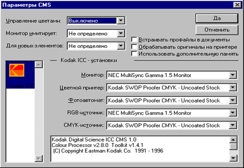 Большинство цветов являются аппаратно-зависимыми: это означает, что восприятие цветов зависит от конкретного устройства, которое используется для их воспроизведения - монитора, сканера, принтера. Каждая публикация программы Page Maker содержит свой собственный набор цветов, доступный через палитру Цвета. Использование палитры Цвета Для назначения различных цветов объектам в Page Maker используется палитра Цвета, вызвать которую можно выполнив команду Окно|Показать Цвета или нажав сочетание клавиш Ctrl+J. В верхней части Цвета расположены следующие элементы управления: ¨ Линия - используется для назначения цвета контурам замкнутых объектов (прямоугольников, эллипсов, многоугольников и фреймов); ¨ Фон - применяется для назначения цвета заливки замкнутых объектов; ¨ Фон и линия - применяется в том случае, когда один и тот же цвет должен быть назначен всему объекту - и его контуру, и заливке; ¨ Оттенок - раскрывается список позволяет задать процентное содержание краски. Для того чтобы создать новый цвет, расположенный в нижней части палитры, или выбрать из меню палитры команду Новый цвет. В результате будет открыто диалоговое окно Параметры цвета, в котором можно определить цветовые координаты для нового цветового образца. Одним из самых сложных вопросов цветового репродуцирования остается точное воспроизведение цветов на печатном оборудовании. С этой точки зрения наилучшие результаты дает использование стандартных простых и составных цветов из профессиональных цветовых систем. Треппинг в публикации Одним из наиболее распространенных дефектов печатной продукции является нарушение приводки. При выводе цветоделенных оригиналов на PostScript-устройство Page Maker может компенсировать потенциальные зазоры между соседними цветами с помощью технологии, называемой треппингом. Настройка режима треппинга производится автоматически во всей публикации несмотря на то, что в конкретных ситуациях Page Maker дает возможность вручную управлять его параметрами. Эффект треппинга проявляется только на цветоделенных оригиналах и цветных совмещенных оттисках; на экране монитора он не виден, поэтому, прежде чем принимать решение о самостоятельном выполнении треппинга, рекомендуется проконсультироваться со специалистами типографии. Page Maker выполняет треппинг для текста, размещенного поверх объектов, созданных с помощью графических инструментов (прямоугольников, многоугольников, линии, эллипсов и окрашенных текстовых фреймов), а также для всех перечисленных объектов при их взаимном наложении. Импортированные изображения при этом игнорируются. Если возникнет необходимость выполнить треппинг в сложном изображении или иллюстрации, делать это следует в тои программе, с помощью которой это изображение было создано, или в специализированной программе для треппинга растровых изображении. Page Maker делает заключение о необходимости треппинга исходя из значении плотности красок и выполняет треппинг стыкующихся цветов на основе анализа значении их нейтральной оптической плотности (т.е. плотности цветов на серой шкале). В большинстве случаев светлые цвета распространяются в сторону темных. При треппинге Page Maker всегда использует метод наложения цветов, печатая линию треппинга поверх более темных объектов. По этой причине результаты треппинга не могут быт