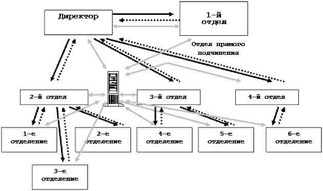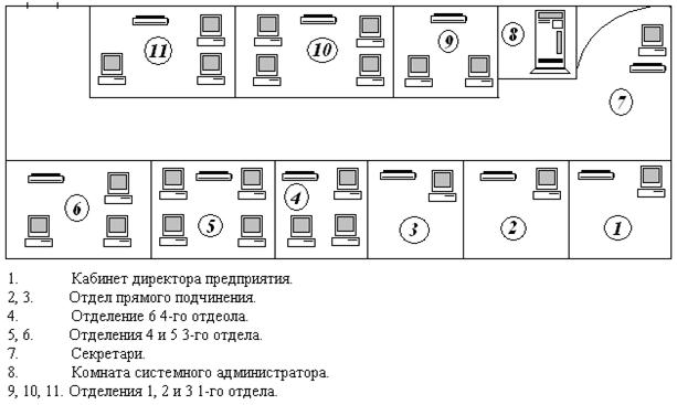 Рис. 4.1 Выбор типа сети. В данном случае на предприятии имеется 30 рабочих станции, которые и требуется объединить в корпоративную сеть. Причем они объединены в следующие группы: - директор предприятия – 1 рабочая станция; - отдел прямого подчинения - 2 рабочих станции; - секретарь – 1 рабочая станция; - отделения 1, 2 и 3 2-го отдела по 3, 3 и 4 рабочих станции соответственно; - отделения 4 и 5 3-го отдела по 4 и 4 рабочих станции; - отделение 6 4-го отдела – 4 рабочих станции. Следуя из схемы выбора типа сети, можно решить, что в данном случае требуется установка сервера, так как мы имеем вертикальную структуру предприятия, то есть разграниченный доступ к информации. Одним из главных этапов планирования является создание предварительной схемы. При этом в зависимости от типа сети возникает вопрос об ограничении длины кабельного сегмента. Это может быть несущественно для небольшого офиса, однако если сеть охватывает несколько этажей здания, проблема предстает в совершенно ином свете. В таком случае необходима установка дополнительных репитеров (repeater). В ситуации с предприятием вся сеть будет располагаться на одном этаже, и расстояние между сегментами сети не столь велико, чтобы требовалось использование репитеров. 4.2. Размещение сервераВ отличие от установки одноранговой сети, при построении ЛВС с сервером возникает еще один вопрос - где лучше всего установить сервер. На выбор места влияет несколько факторов: - из-за высокого уровня шума сервер желательно установить отдельно от остальных рабочих станций; - необходимо обеспечить постоянный доступ к серверу для технического обслуживания; - по соображениям защиты информации требуется ограничить доступ к серверу;