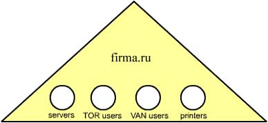 Рис. 5.3. Лес Домен Sidoroff.ru является частью леса, так же как и firma.ru, но по-прежнему остается доменом и может иметь собственное дерево. Заметьте, что здесь существуют транзитивные доверительные отношения между «корневыми» доменами каждого дерева в лесу – это позволит пользователям домена acmeplunbing.com получать доступ к ресурсам в дереве firma.ru и наоборот, в то же время поддерживает проверку подлинности в собственном домене. Первый домен, созданный в лесу, рассматривается как «корень» леса. Одна из самых важных особенностей леса – это то, что каждый отдельный домен поддерживает общую схему – определения для различных объектов и связанных с ними атрибутов, которые созданы в лесу. Важно осознать, что лес может быть создан из одного дерева, которое содержит всего один домен. Это будет маленький лес, но формально это будет лес. [4] 5.1.2.4 Организационные единицыОрганизационные единицы (обычно называемые OU) – это контейнеры внутри Active Directory которые создаются для объединения объектов в целях делегирования административных прав и применения групповых политик в домене. OU могут быть созданы для организации объектов несколькими путями, в соответствии с их функциями, местоположением, ресурсами и так далее. Примером объектов, которые могут быть объединены в OU могут служить учетные записи пользователей, компьютеров, групп и т.д. Рисунок 5.1.3 показывает пример OU, основанной на местоположении пользователей и ресурсов: