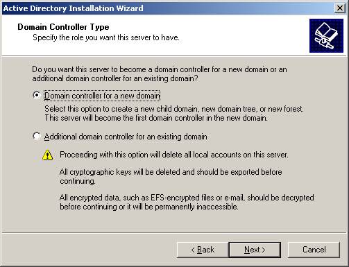 Рис. 5.5. Installation Wizard После того, как контроллер домена создан, он хранит копию базы данных Active Directory (ntds.dit) и может проводить аутентификацию пользователей домена. База данных Active Directory состоит из того, что принято называть тремя разделами, как показано на рисунке 5.1.5.