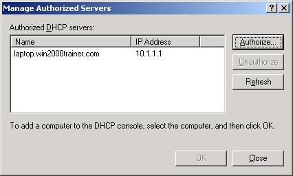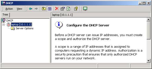Рис. 5.7. Консоль DHCP. Для авторизации DHCP сервер, нужно щелкнуть правой кнопкой мыши на значке сервера и выбрать опцию Authorize (авторизовать) из появившегося меню. Для управления авторизованным DHCP сервером (включая добавление или удаление авторизованных серверов), щелкните правой кнопкой мыши на иконке DHCP и выберите Manage Authorized Servers (управление авторизованными серверами), как показано на рисунке 5.8:
