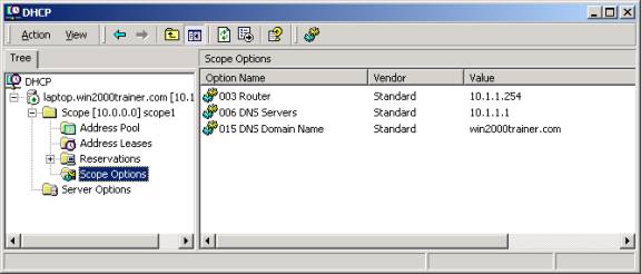 Рис. 5.9. Консоль DHCP. После того, как сервер авторизован и область настроена, стрелка на иконке сервера меняется на зеленую и теперь указывает вверх. Области в Windows 2000 Advanced Server: - Области могут быть собраны или объединены для создания суперобластей. Они позволяют распределять диапазоны IP-адресов, которые не примыкают друг к другу, но расположены на одной подсети. - Для изменения маски подсети, связанной с областью, необходимо будет удалить область и создать ее заново. - Время аренды адреса по умолчанию для области – 8 дней, что отличается от значения в Windows NT, где оно составляло 72 часа. Это значение может быть изменено в зависимости от потребностей сети. - Каждый диапазон IP-адресов может быть представлен только в одной из областей. Если серверы DHCP не будут скоординированы и два сервера будут иметь одинаковые диапазоны адресов в своих областях, тогда один и тот же адрес может быть назначен разным клиентам в одной сети. Также надо быть уверенным, что исключены все статически назначенные IP-адреса из областей. - Для создания отказоустойчивых областей необходимо настроить 2 (или более) сервера DHCP и разделить диапазоны адресов из каждой области между ними. При такой конфигурации, если один из серверов выйдет из строя, другой будет продолжать распределять допустимые адреса между клиентами. - Настройки DHCP могут быть осуществлены на 4 различных уровнях: на уровне Server (сервера) (установки влияют на все области), Score (область) (установки влияют только на область), Client (клиент) (установки для зарезервированного клиента) Class (класс) (для компьютеров, которые входят в различные, заранее определенные, классы). Протокол упрощает работу сетевого администратора, который должен вручную конфигурировать только один сервер DHCP. Когда новый компьютер подключается к сети, обслуживаемой сервером DHCP, on запрашивает уникальный IP-адрес, а сервер DHCP назначает его из пула доступных адресов, Этот процесс состоит из четырех шагов: 1. Клиент DHCP запрашивает IP-адрес (DHCP Discover, обнаружение), 2. DHCP-сервер предлагает адрес (DHCP Offer, предложение), 3. Клиент принимает предложение и запрашивает адрес (DHCP Request, запрос) и адрес официально назначается сервером (DHCP Acknowledgement, подтверждение). Чтобы адрес не "простаивал", сервер DHCP предоставляет его на определенный администратором срок, это называется арендным договором (lease). По истечении половины срока арендного договора клиент DHCP запрашивает его возобновление, и сервер DHCP продлевает арендный договор. Это означает, что когда машина прекращает использовать назначенный IP-адрес (например, в результате перемещения в другой сетевой сегмент), арендный договор истекает, и адрес возвращается в пул для повторного использования. Протокол DHCP в Microsoft Windows 2000 Server был дополнен новыми функциями, что упростило развертывание, интеграцию и настройку сети. Интеграция с DNS. Серверы DNS обеспечивают разрешение имен для сетевых ресурсов и тесно связаны со службой DHCP. В Windows 2000 серверы DHCP и клиенты DHCP могут регистрироваться в DNS. Улучшенное управление и мониторинг. Новая возможность обеспечивает уведомление об уровне использования пула IP-адресов. Оповещение производится при помощи соответствующего значка либо при помощи передачи сообщения. Распределение групповых адресов. Добавлена возможность назначения групповых адресов. Типичные приложения для групповой работы