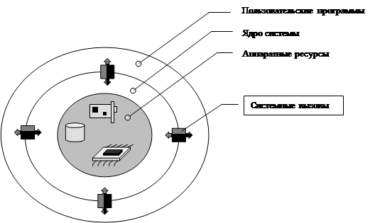 Рис 1.1 В центре находятся аппаратные ресурсы компьютера с которыми непосредственно взаимодействует ядро операционной системы изолируя прикладные программы пользователя от особенностей аппаратной архитектуры. Ядро имеет определенный минимальный набор услуг представляемых прикладным программам. В первую очередь это операции ввода-вывода (открытие, закрытие, чтение, запись и управление файлами), создание и управление процессами, организация синхронизации и обмена данными между процессами, управление памятью (реальной и виртуальной). Второй важнейшей функцией выполняемой ядром является защита операционной системы от разрушения со стороны пользовательских программ и реализация механизмов защиты данных в многопользовательской среде. Все пользовательские приложения пользуются услугами ядра посредством системных вызовов. На втором уровне находятся приложения, как пользовательские, обеспечивающие интерфейс с пользователем так и системные, управляющие работой системы. Несмотря на различные выполняемые задачи, схемы их взаимодействия с ядром одинаковы. Задачи выполняемые ядром операционной системыОстановимся более подробно на структуре ядра операционной системы. Функционально его можно представить состоящим из трех основных подсистем: подсистемы управления процессами и памятью, подсистемы ввода-вывода и файловой подсистемы. Все современные микропроцессоры поддерживают виртуальную память, защищенный и многозадачный режим работы. Последний подразумевает выделение кванта процессорного времени определенной задачи с последующим переключением на другую задачу Каждая задача имеет идентификатор уровня защиты, некоторые команды из системы команд процессора могут выполняться на любом уровне защиты, но есть привелигированные команды выполнение которых возможно лишь задачей имеющей нулевой уровень привилегии. Ядро операционной системы работает на нулевом уровне защиты, только оно имеет непосредственный доступ к физической памяти, системным регистрам процессора и портам ввода вывода. Пользовательские программы общаются с ядром посредством системных вызовов, представляющих собой команду приводящую к переключению процесса в контекст ядра, передачей параметров ядру. Затем ядро проверяет корректность параметров, права пользовательского процесса на возможность выполнения данного системного вызова и лишь после этого переходит к непосредственному выполнению всех низкоуровневых действий необходимых для исполнения пользовательского запроса. Благодаря этому достигается защита критически важных данных ядра от случайного или преднамеренного разрушения со стороны пользователя. Второй из важнейших функций ядра является обработка исключительных ситуаций возникающих в результате работы операционной системы и представляющим собой програмные прерывания. К последним относятся ошибки защиты (на пример попытка прикладной программы получить доступ к портам ввода-вывода или чужой области памяти), ошибки в работе оборудования, а также системные события возникающие при нормальной работе операционной системы. Некоторые из исключительных ситуаций приводят к аварийному завершению системы (ошибки оборудования или исключительная ситуация возникшая во время обработки исключительной ситуации), некоторые к ава