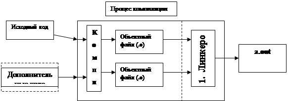 На самом деле процесс компиляции намноого сложнее. Этот процес компиляции занимает несколько этапов. 1) Для каждого исходного файла запускаеться компилятор который создает обьектный файл (если исходные коды написаны на разных языках програмирования, то для каждого запускаеться тот соотвествующий компилятор) 2) После компиляция (этап создания) обьектных файлов запускаеться линковщик (HP-UX linker (ld)) На картинке можете увидеть более детальный процес компиляции: