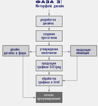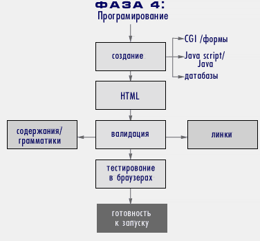 Вы изучили своего заказчика, представляете содержание каждой будущей страницы и вовсю идет работа над текстами. Самое время заняться интерфейсом. Начните с самой важной страницы, работайте над ней до тех пор, пока у вас не будет как минимум 15 набросков различных вариантов, из которых 5 можно развить дальше. Когда страничка начнет дымиться, поработайте над другими. Продолжайте искать идеи, рисовать и думать. Попробуйте поэксперементировать с различными эффектами: real audio/vidio, динамическое html, необычное использование тегов и т.д. Пусть ваш альбом наполнится зарисовками для входного экрана, навигационных элементов, ключевой графики и второстепенных, украшающих элементов. Используйте коллаж. Проанимируйте частицу большого изображения. Поиграйте со шрифтами, слоями, текстурами, эмоциями. Как только вы найдете удачную тему, проработайте ее как можно глубже, потом отложите в сторону и примитесь за новую. Вообразите себя пользователем и попробуйте смотреть на окружающий мир, Интернет его глазами. Походите по сайтам, где он может бывать, полистайте его журналы, пообщайтесь с его возможным окружением... Используйте графический редактор. Очень удобно скопировать окно браузера (F13 или Print Scrn, далее Ctrl+double click в окне графического редактора, затем Ctrl+V в новый файл) в Фотошоп или Иллюстратор и накладывать слои композиции прямо на него. Выберите 3 законченных варианта: ваш любимый, несколько экстравагантный и консервативный, который, вы уверены, понравится заказчику. Создайте для них прототипы, которые он сможет посмотреть и одобрить. Прототип - черновой вариант слинкованных между собой основных страниц сайта. Не обязательно писать код для этих страниц, вы прекрасно можете обойтись image-maps. Пореже страницы на части и пролинкуйте графику между собой. Не тратьте время на ее оптимизацию, и объясните заказчику, что она немного потеряет в качестве при дальнейшей обработке. Задача прототипов - хорошо смотреться в окне браузера и понравится заказчику. Программирование.