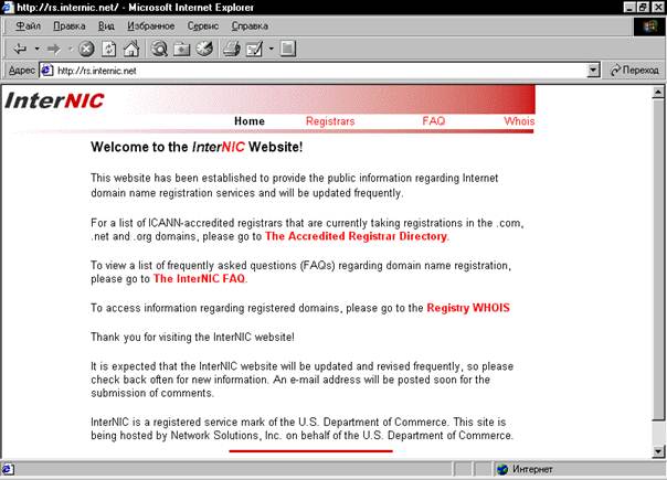 Рисунок1.1:Добро пожаловать на сервер InterNIC Доменные имена