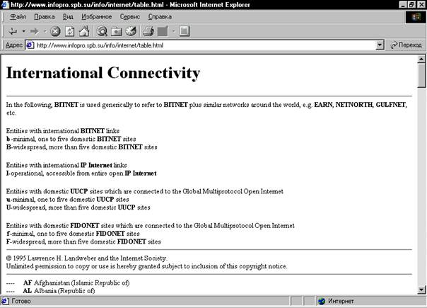 Исторически сложилось так, что эти семь доменов верхнего уровня по умолчанию обозначают факт географического расположения (принадлежащего к ним ) хоста на территории США. Поэтому международный комитет InterNIC наряду с вышеперечисленными доменами верхнего уровня допускает применение доменов (специальных сочетаний символов) для идентификации иных стран, в которой находится организация-владелец данного хоста. Имеются двухбуквенные обозначения для всех стран мира:.ru-для России (пока в ходу и домен .su, объединяющий хосты на территории республик бывшего СССР), .ca-для Канады, .uk-для Великобритании и т.д. Они обычно используются вместо одного из семи идентификаторов, перечисленных выше в таблице 1.3. С полным списком всех доменных имен государств можно познакомится на различных серверах в Internet ,к примеру, на сервере известного петербургского провайдера “Peterlink” (http://www.infopro.spb.su/info/internet/table.html)(смотри рис.1.2)
