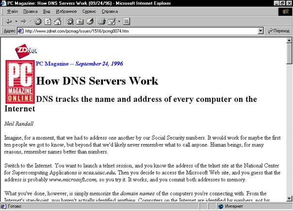 Рисунок 1.3.Информацию о работе DNS можно найти на многих серверах Internet.На этом рисунке приводиться ссылка на статью, расположенную на сервере журнала PC Magazine На этих компьютерах размещена информация о хост-компьютерах серверов имён, обслуживающих семь доменов высшего уровня: .com, .edu, .mil, .gov, .net, .org и специального .arpa (смотри таблицу 1.3). Любой из этих девяти серверов несёт так же файл высшего уровня, как .uk (Великобритания), .de (Германия), .jp (Япония) и так далее. В файлах корневой зоны содержатся все имена хост-компьютеров и IP-адреса серверов имён для каждого поддомена, входящего в домен высшего уровня. Другими словами, каждый корневой сервер располагает информацией обо всех доменах высшего уровня, а так же знает имя хост-компьютера и IP-адрес, по меньшей мере одного сервера имён, обслуживающего каждый из вторичных доменов, входящих в любой домен высшего уровня. (Для доменов иностранных государств в базе данных хранятся сведения по серверам имён для каждой страны). Например, в неком домене company.com файлы корневой зоны для домена содержат данные о сервере имён для любого адреса, заканчивающегося на company.com. Кроме серверов имён корневой зоны, существуют локальные серверы имён, установленные в доменах более низкого уровня. Локальный сервер имён кэширует список хост-компьютеров, поиск которых он производил в последнее время. Это устраняет необходимость постоянно обращаться в систему DNS с запросами о часто используемых хост-компьютерах. Кроме того, локальные серверы имён являются итерционными, а серверы корневой зоны – рекурсивными. Это значит, что локальный сервер имён будет повторять процедуру запроса информации о других серверах имён до тех пор, пока не получит ответа. Корневые же серверы Internet, находящиеся на вершине структуры DNS, напротив, лишь выдают указатели на домены следующего уровня. Добраться до конца цепочки и получить требуемый IP-адрес – задача локального сервера имён.Чтобы решить её, он должен спуститься по иерархической структуре, последовательно запрашивая у локальных серверов имён указатели на ее низшие уровни. Записи почтового обмена Если мы затронем другой случай – доставку сообщений электронной почтой, то он подразумевает использование специальных функций DNS, так называемых MX-записей (Mail Exchange – почтовый обмен). В них содержаться указатели на хост-компьютеры, по адресу которых нужно отправить сообщение электронной почты для их последующей доставки в индивидуальные ящики. При этом указанные в MX-записи хост-компьютеры электронной почты не обязательно содержат почтовый ящик пользователя; это может быть шлюз или хост-компьютер, получающий почту для другогого компьютера. В примере из журнала PC Week, который мы сейчас используем, вы посылаете почтовое сообщение главе корпорации Microsoft Биллу Гейтсу по адресу billg@microsoft.com.В действительности на указанном хост-компьютере microsoft.com нет почтового ящика billg. Зато сервер DNS, который обслуживает домен microsoft.com, хранит относящуюся к нему MX-запись. В ней указан другой компьютер, куда в конечном итоге должна быть направлена почта для billg и других адресатов. Преимущество такого подхода – в гибкости, которую получает в нашем примере Microsoft (хотя использование такого переназначения – обычное дело в Internet). У получателя появляется возможность изменять конфигурацию хост-компьютера электронной поч