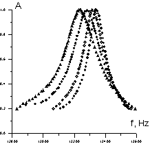 Пьезокерамический излучатель слабой волны (2) был приклеен к торцу образца (1) и массивному (М= 2 кг) титановому концентратору (4), являющемуся излучателем мощной волны накачки (ее минимальный уровень превышал максимальный уровень слабой волны примерно на 30 дБ), так что граничное условие на этом торце резонатора было близко к условию на абсолютно жесткой поверхности. К другому концу стержня приклеивался пьезоакселерометр (6) достаточно малой массы, так что эта граница была близка к акустически мягкой. Для таких резонаторов спектр собственных частот определяется следующим выражением: fn=c0(2n‑1)/4L, где c0 - скорость продольной волны в стержне, n = 1,2…- номер продольной моды резонатора. С пьезоакселерометра сигнал поступал на спектроанализатор (10) для измерения амплитуды накачки, а также через режекторный фильтр (9), подавляющий сигнал на частоте накачки на 30 дБ, на селективный вольтметр (8) и осциллограф (7), где производилось измерение уровня слабого сигнала. Собственные частоты первых продольных мод резонатора при малых амплитудах возбуждения составляли соответственно 2250 Гц, 6800 Гц, 10150 Гц и 16650 Гц, а добротности - 45, 90, 81 и 93. Таким собственным частотам соответствует c0»2500 м/с. Измерения проводились для слабой волны на 4-й моде резонатора и для накачки на 1-й моде, а также - наоборот. На рис.3 приведены резонансные кривые для слабой волны на 4-й моде в присутствии накачки на 1-й моде при различных ее амплитудах. Видно, что с ростом амплитуды волны накачки происходит сдвиг резонансной частоты и расширение резонансной кривой, т.е. уменьшение добротности резонатора