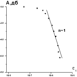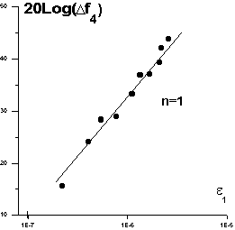На рис.4 в логарифмическом масштабе приведена зависимость сдвига резонансной частоты DF от амплитуды деформации волны накачки e1, из которого следует, что DF µe1. На рис.5 приведена зависимость амплитуды слабой волны A (в резонансе) от e1, из которого видно, что A µe1. Аналогичные зависимости наблюдались и в случае возбуждения слабой волны на 1-й моде резонатора, а накачки - на 4-й.
