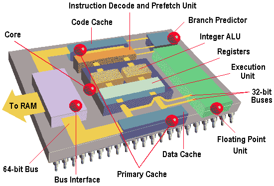 Рис. 1 Внутреннее строение процессора Все элементы процессора синхронизируются с использованием частоты часов, которые определяют скорость выполнения операций. Самые первые процессоры работали на частоте 100kHz, сегодня рядовая частота процессора - 2000MHz, иначе говоря, часики тикают 2000 миллионов раз в секунду, а каждый тик влечет за собой выполнение многих действий. Счетчик Команд (PC) - внутренний указатель, содержащий адрес следующей выполняемой команды. Когда приходит время для ее исполнения, Управляющий Модуль помещает инструкцию из памяти в регистр инструкций (IR). В то же самое время Счетчик команд увеличивается, так чтобы указывать на последующую инструкцию, а процессор выполняет инструкцию в IR. Некоторые инструкции управляют самим Управляющим Модулем, так если инструкция гласит 'перейти на адрес 2749', величина 2749 записывается в Счетчик Команд, чтобы процессор выполнял эту инструкцию следующей. Многие инструкции задействуют Арифметико-логическое Устройство (АЛУ), работающее совместно с Регистрами Общего Назначения - место для временного хранения, которое может загружать и выгружать данные из памяти. Типичной инструкцией АЛУ может служить добавление содержимого ячейки памяти к регистру общего назначения. АЛУ также устанавливает биты Регистра Состояний (Status register - SR) при выполнении инструкций для хранения информации о ее результате. Например, SR имеет биты, указывающие на нулевой результат, переполнение, перенос и так далее. Модуль Управления использует информацию в SR для выполнения условных операций, таких как 'перейти по адресу 7410 если выполнение предыдущей инструкции вызвало переполнение'. Это почти все что касается самого общего рассказа о процессорах - почти любая операция может быть выполнена последовательностью простых инструкций, подобных описанным. 2.2. Алгоритм работы процессора Весь алгоритм работы процессора можно описать в трех строчках НЦ | чтение команды из памяти по адресу, записанному в СК | увеличение СК на длину прочитанной команды | выполнение прочитанной команды КЦ Однако для полного представления необходимо определить логические схемы выполнения тех или иных команд, вычисления величин, а это уже функции Арифметико-логического Устройства 2.2.1. Арифметико-логическое Устройство На уровне логических схем АЛУ состоит из логических элементов, сумматоров, триггеров и некоторых других элементов. Логический элемент - электронная схема, реализующая элементарную переключающую функцию. При реализации функций переключения входные переменные соответствуют входным сигналам, а выходной сигнал представляет собой значение функции. Всего существует десять логических элементов, реализующих десять логических (элементарных или сложных) функций. Логическая схема может реализовать сложную функцию алгебры логики, а может входить в состав другого функционального блока процессора (сумматора, дешифратора, регистра, триггера.) Триггер - электронная схема с двумя устойчивыми состояниями, предназначенная для хранения одного бита информации. Триггер переходит из одного устойчивого состояния в другое при воздействии некоторого входного сигнала. Триггер имеет вход для установки в состояние 0 (X0) и в 1 (X1). На выходе выдается состояние триггера, которое выдается в прямом (Y) и в инверсном (Y1) виде. В компьютерах используют