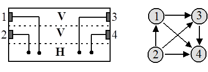 Рис.1. Если в канале существуют контакты, расположенные на боковых сторонах, то порядок их расположения также отражается в графе дополнительными ребрами. На рисунке 2 приведен пример канала, содержащего четыре цепи a, b, c, d с контактами на боковых сторонах, и соответствующий граф вертикальных ограничений.