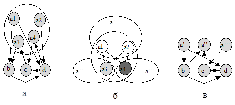 Рис. 2. Задача приведения VCG к ациклическому виду (задача 2) может быть сформулирована следующим образом: используя информацию о цепях в канале и о графе вертикальных ограничений, так изменить конфигурацию цепей, чтобы соответствующий VCG не имел циклов. Основная идея, положенная в основу алгоритмов решения этой задачи, состоит в расщеплении вершины графа, которая участвует в создании цикла, на две или более части. Это соответствует разделению горизонтального сегмента на два или более новых сегмента. Такие механизмы были предложены Дойчем [2] (терминальный доглег) и Прессом [5] (нетерминальный доглег). Эти варианты доглега отличаются друг от друга способами перераспределения контактов горизонтального сегмента между новыми сегментами. Местоположение контактов определяет существование и ориентацию ребер между соответствующими вершинами VCG, поэтому метод разделения контактов на группы в наибольшей степени влияет на успех процедуры удаления циклов. При терминальном доглеге контакты делятся по признаку левый - правый относительно контакта, по которому происходит разбиение. При этом в цепи может появиться несколько горизонтальных сегментов, но нет гарантии удаления циклов. При нетерминальном доглеге, в свою очередь, контакты сегмента разделяются на две группы по признаку верхний - нижний. Этот метод гарантирует удаление всех циклов, проходящих через расщепляемую вершину, при условии, что верхние контакты порождают только выходящие ребра, а нижние - только входящие. Наличие в канале более двух коммутационных слоев и контактов на боковых сторонах приводит к тому, что контакт может порождать в VCG входящие и выходящие ребра одновременно. В этом случае разделения контактов на верхние и нижние недостаточно и для успешного разбиения вершины требуется дополнительный анализ графа и, возможно, многократный (мульти-) доглег. В данной статье предлагается алгоритм мульти-доглега, который способен эффективно расщеплять вершины в такой ситуации. Он состоит из следующих шагов: 1. Если в VCG нет циклов либо уже рассмотрены все его вершины, то завершить работу алгоритма. 2. Найти критическую вершину в VCG, выбирая среди еще не рассмотренных вершин. 3. Построить расширенный граф вертикальных ограничений. 4. Построить локальный граф контактов. Если в локальном графе контактов нет петель, то раскрасить его в минимальное число цветов, иначе вернуться на шаг 1. 5. Расщепить вершину в соответствии с цветами контактов. 6. Создать вертикальное соединение для доглега, если это возможно, и вернуться на шаг 1. Рассмотрим отдельные шаги алгоритма более детально. На шаге 2 для каждой итерации выбирается критическая вершина в VCG. Критерием выбора является значение следующей функции: f = cyclesa * width-b * priority-g , где cycles - количество циклов, проходящих через данную вершину, width - ширина, priority - приоритет соответствующей цепи, a > 0, b ³ 0, g ³ 0 - коэффициенты важности перечисленных параметров, которые выбираются пользователем в зависимости от конкретной задачи. Определенная таким образом функция выбора позволяет расщеплять большее количество циклов за одну итерацию, выбирать для доглега цепи меньшей ширины, а также не усложнять конфигурацию приоритетных цепей, например цепей земли/питания. На шаге 3 для найденной критической вершины a строится расширенный граф вертикальных огр