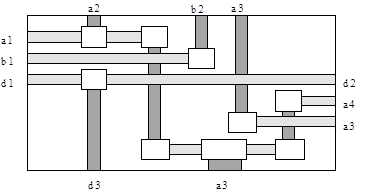 Рис.5.Трассировка сложного примера Разработанный алгоритм приведения VCG к ациклическому виду обеспечивает, в отличие от известных алгоритмов, трассировку многослойных каналов с контактами, расположенными на любой стороне и в любом коммутационном слое, что является в настоящее время необходимым технологическим условием применения САПР СБИС. Список литературы A.Hashimoto and J.Stivens. “Wire routing by optimization channel assignment within large apertures.” Proc. Of the 8th Design automation workshop, pp. 155-163, 1971. Deutsch D.N. “A Dogleg Channel Router” in Proc. 13th Design Automat. Conf. June 1976, pp. 425-433. T.Yoshimura, E. S. Kuh “Efficient algorithm for channel routing”, IEEE Transactions on Computer-Aided Design, CAD-1(1):25-30, January 1982. H.H.Chen, E. Kuh “Glitter: A gridless variable-width channel routing”, IEEE Transactions on Computer-Aided Design, CAD-5(4):459-465, 1986. Bryan Preas “Channel Routing With Non-Terminal Doglegs”, Proc. European Design Automation Conference (EDAC), March 1990, pp. 451-458. Берж К. “Теория графов и ее применения”, Иностранная Литература, Москва, 1962. |