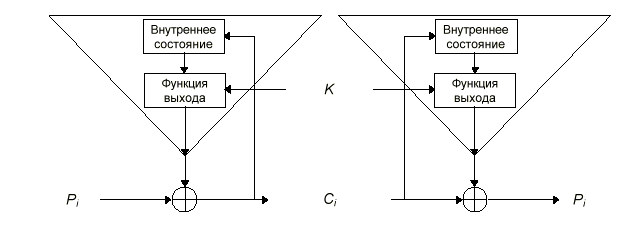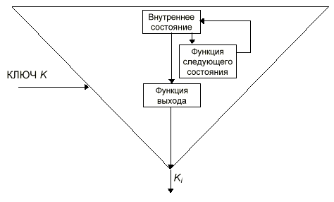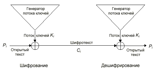 Б Рис. 2. Потоковый шифр. Для всех потоковых шифров используются ключи. Выход генератора потока ключей является функцией ключа. Теперь, если получить пару открытый текст/шифротекст, то можно читать только те сообщения, которые зашифрованы тем же ключом. Потоковые шифры особенно полезны для шифрования бесконечных потоков коммуникационного трафика, например, канала Т1, связывающего два компьютера.